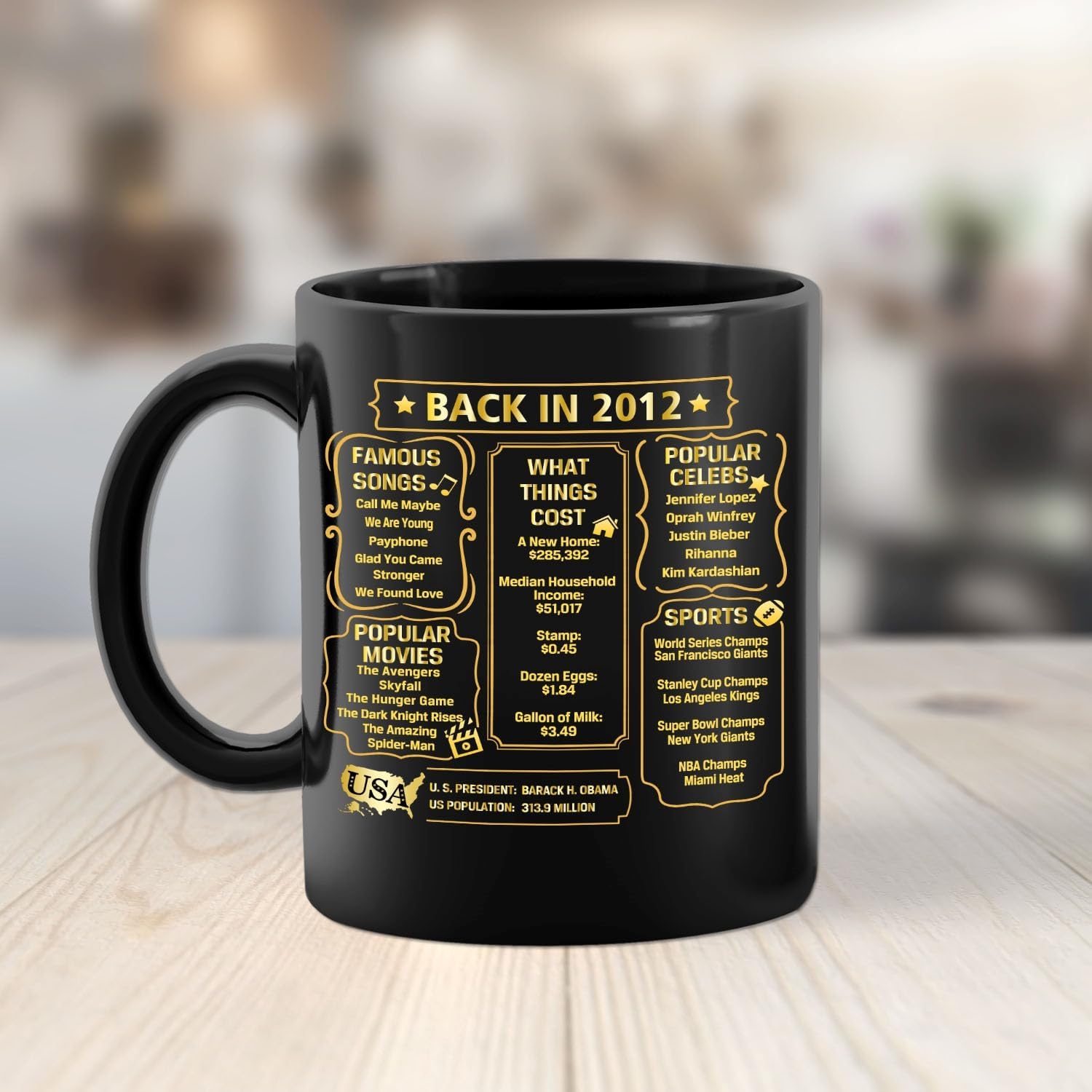 - Nostalgic Design: Featuring a stylish and timeless design, this mug highlights the significance of the year 2012. Ideal for those who appreciate a touch of nostalgia, it's a unique and thoughtful gift that stands out from the ordinary.