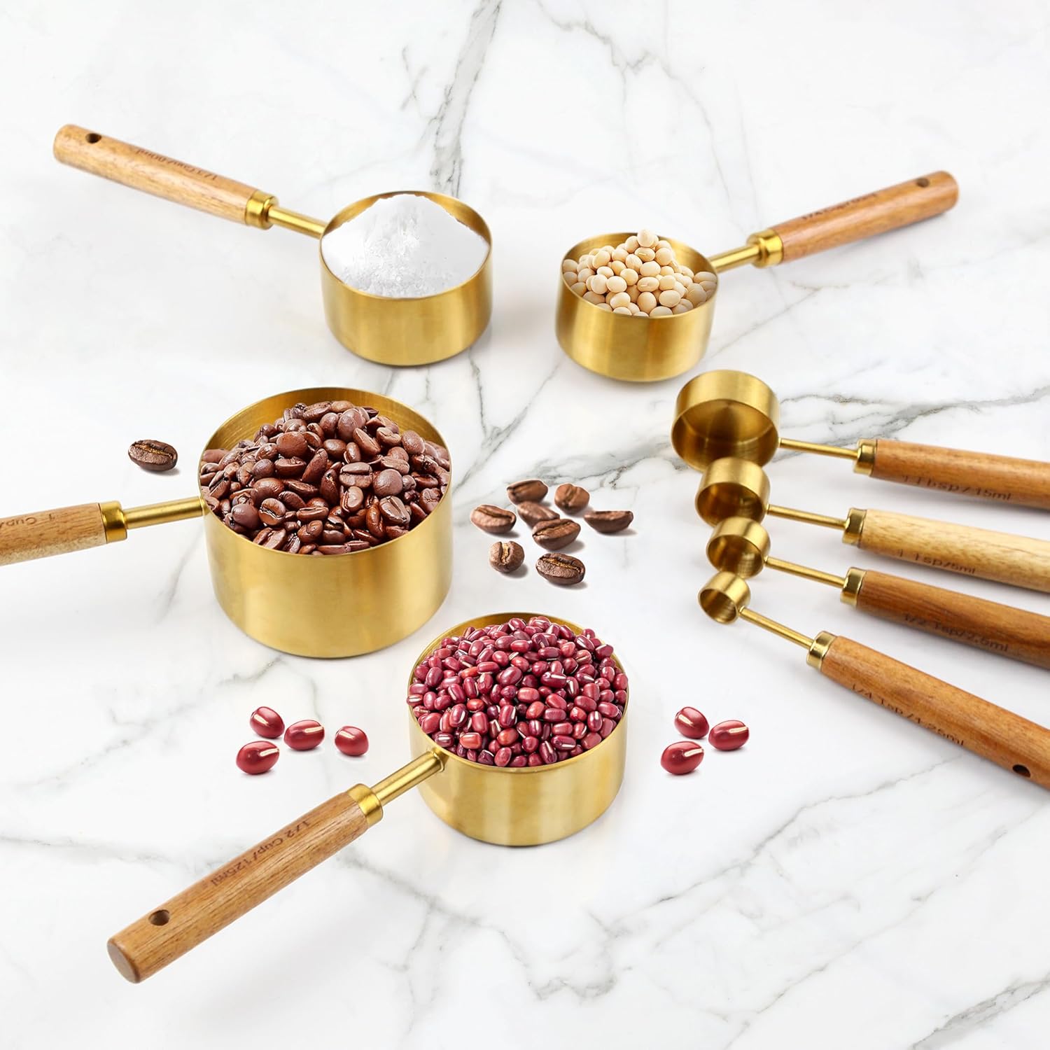 - 【Optimal Set Variety】The gold measuring cups and spoons set comprise 8 distinct capacities: 1 cup (250 ml), 1/2 cup (125 ml), 1/3 cup (80 ml), 1/4 cup (60 ml), 1 tbsp (15 ml), 1 tsp (5 ml), 1/2 tsp (2.5 ml), and 1/4 tsp (1.25 ml), catering to all your cooking and baking requirements.
