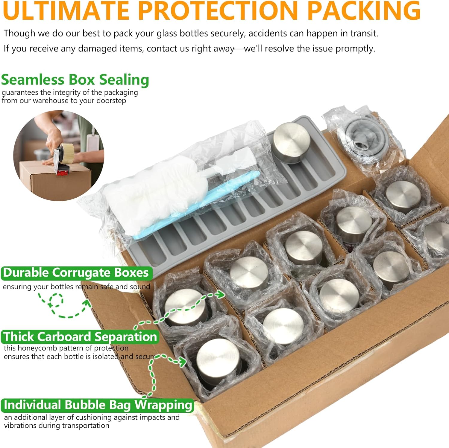 - AIRTIGHT AND LEAK PROOF: Juicing Kit Bundle includes : 6 pack clear 24 oz Zukro glass juice bottles with airtight lids, a bottle cleaning brush for easy hand washing, a funnel helps you pour liquids inside the glass containers, an ice stick tray makes long and narrow ice cubes for adding ice easily, extra 2pc stainless steel airtight lids to ensure that the reusable glass bottles always remain sealed. Get our juicing bottles in bulk packs as gift for your whole family and friends