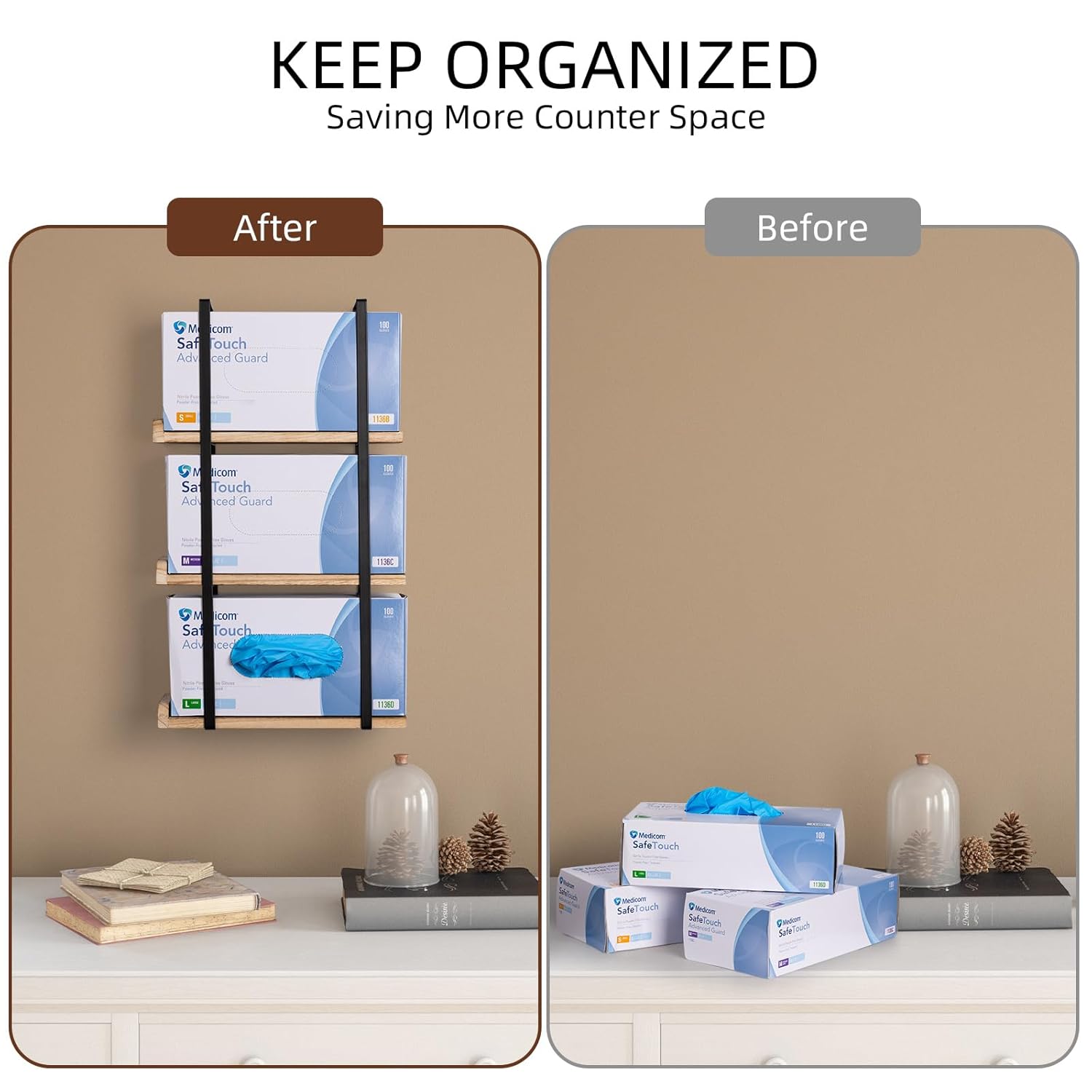 - SPACE SAVING AND ALL IN ONE PLACE - Our three-tier glove box holder, with a compact design, efficiently utilizes vertical space. Keeps your counter area clean, clutter-free, and maximizes functionality. The versatile design allows for the use of different sizes in one glove box holder.