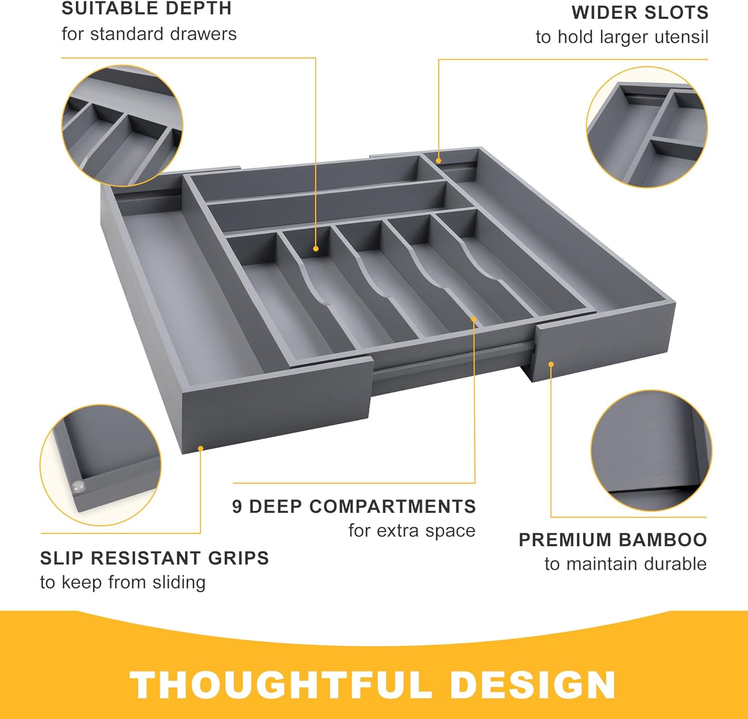 Large Premium Bamboo Silverware Organizer - Expandable Drawer Organizer & Utensil Organizer - 17"x19.7" Cutlery Tray with Dividers for Kitchen Utensils and Flatware (7-9 Slots) (Grey)
