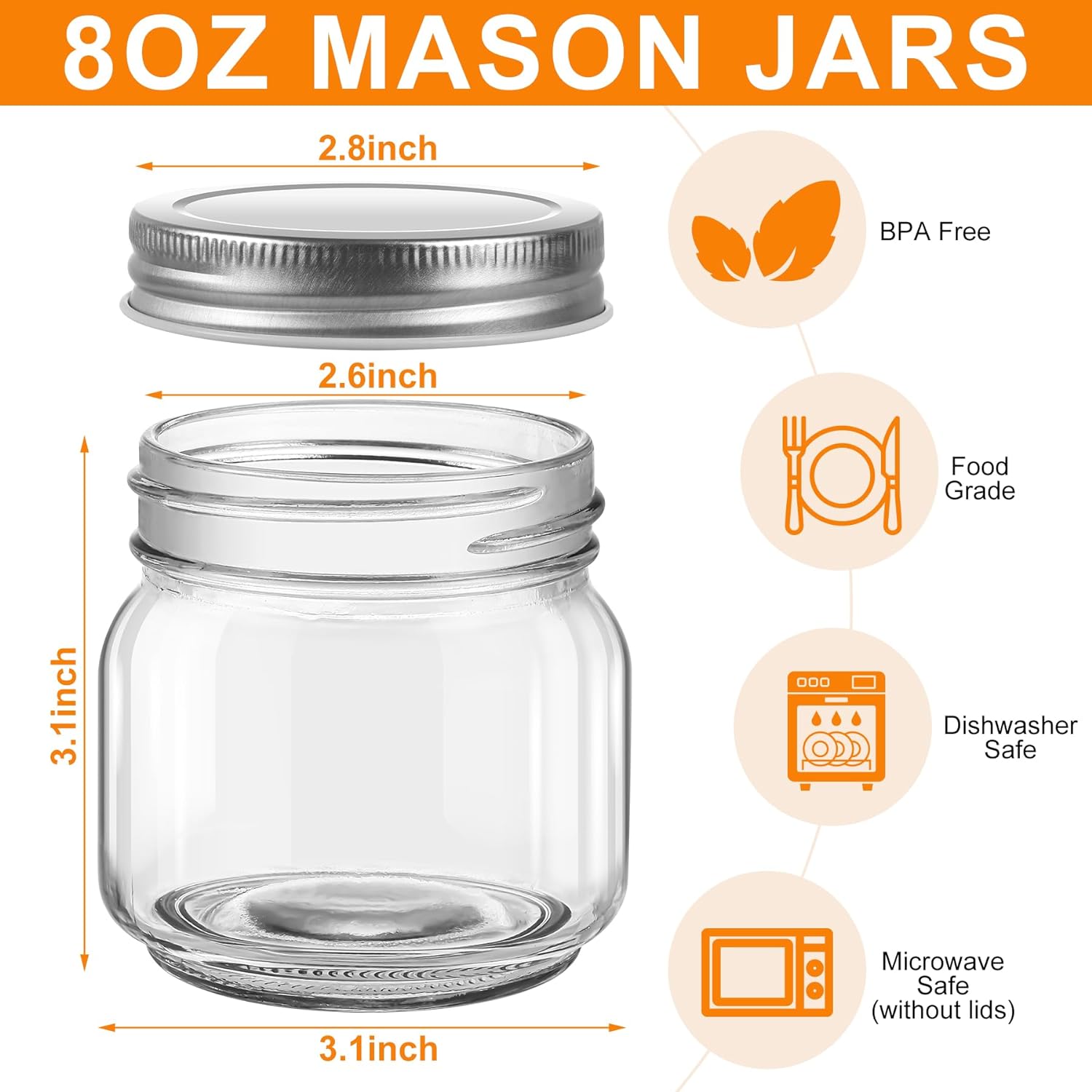 - EXCELLENT MATERIAL: Made from high-quality glass, these 8 oz small mason jars are durable and reliable, guaranteeing long-lasting use. This top-notch material ensures that the glass jars bulk can withstand various temperatures and won't crack or break easily, providing you with peace of mind and trust in their performance.