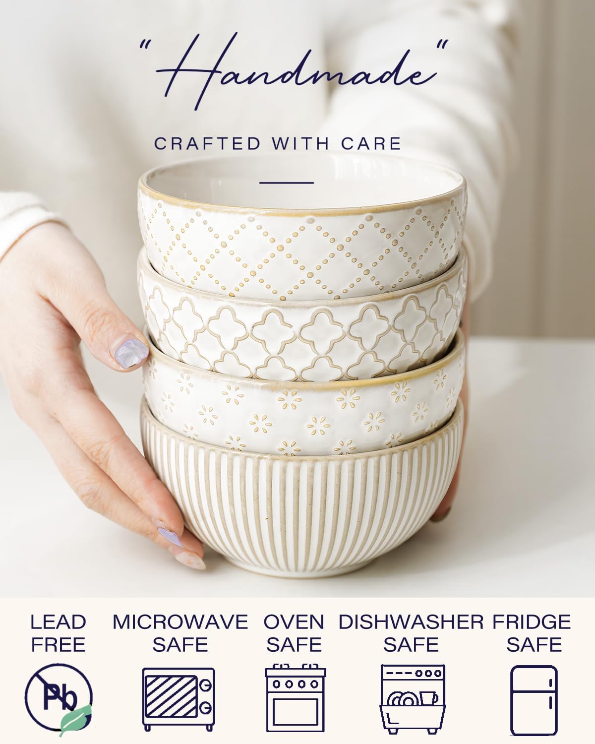 - 【Durable Stoneware】Made of premium ceramic, crafted with a farmhouse decor finish, embossed with 4 different patterns, this aesthetically-pleasing ceramic bowls set offer scratch resistance and durability, ensuring long-lasting use