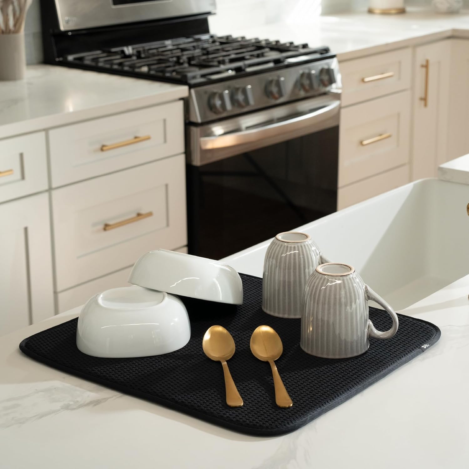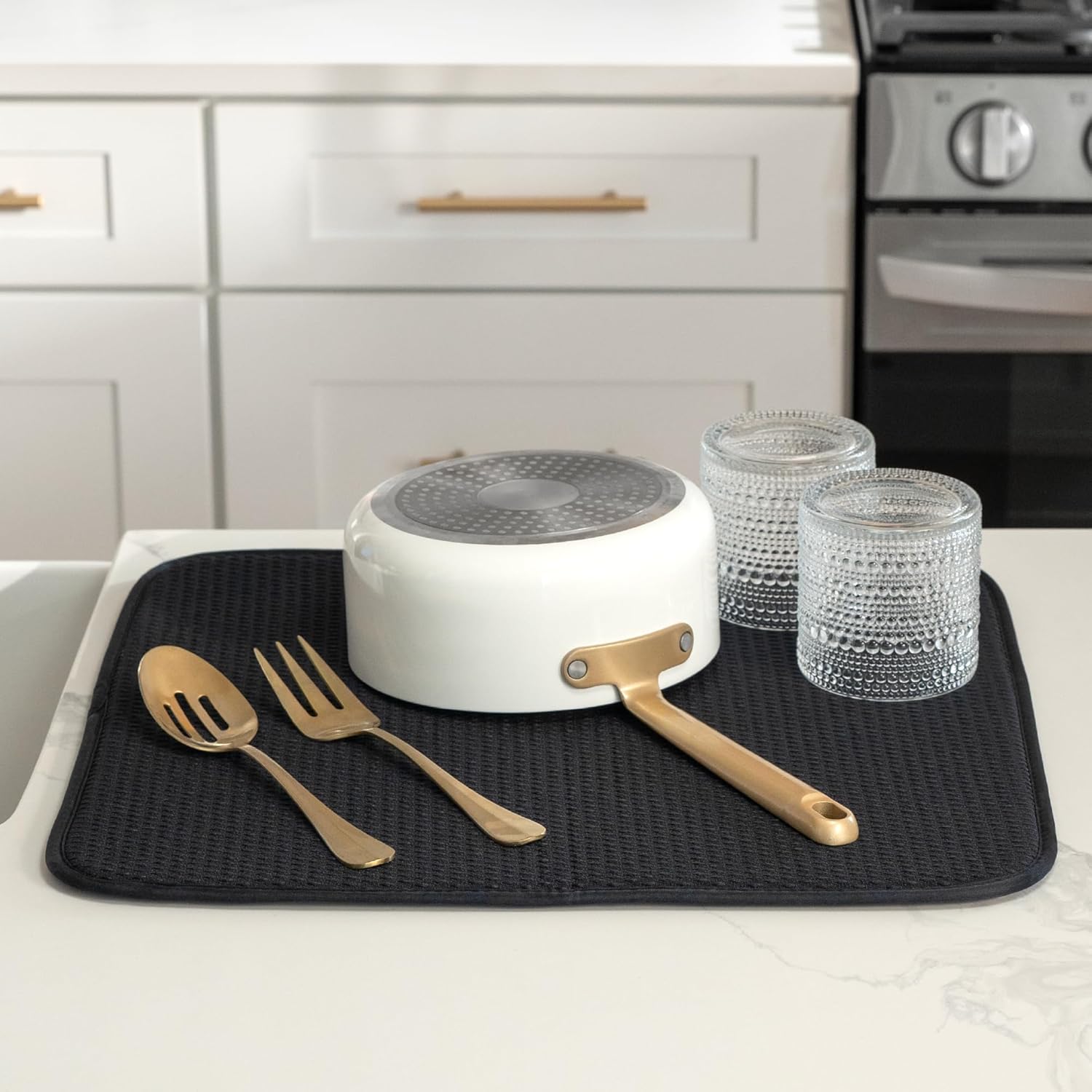- One Envision Home by S&T INC. Microfiber Dish Dry Mat measuring 16 in. x 18 in.; kitchen mat for countertop absorbs up to 4 times its weight in water to keep your countertop dry, unlike a silicone dish drying mat