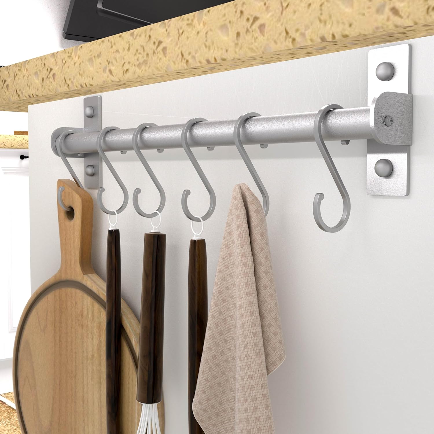 - Easy to install, sizes: 15-3/4 L x 4-1/2 H x 1-5/8 inch, including 2 x kitchen rail with 16 S hooks, mounting hardware, silver color,