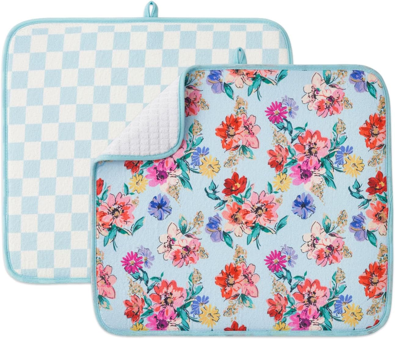 FRESHMINT Printed Dish Drying Mats for Kitchen Counter 2 Pack Absorbent Reversible Drying Mats Microfiber Kitchen Countertop Protector Dishes Drying Pad Extra Large 18"x16" Dish Mat