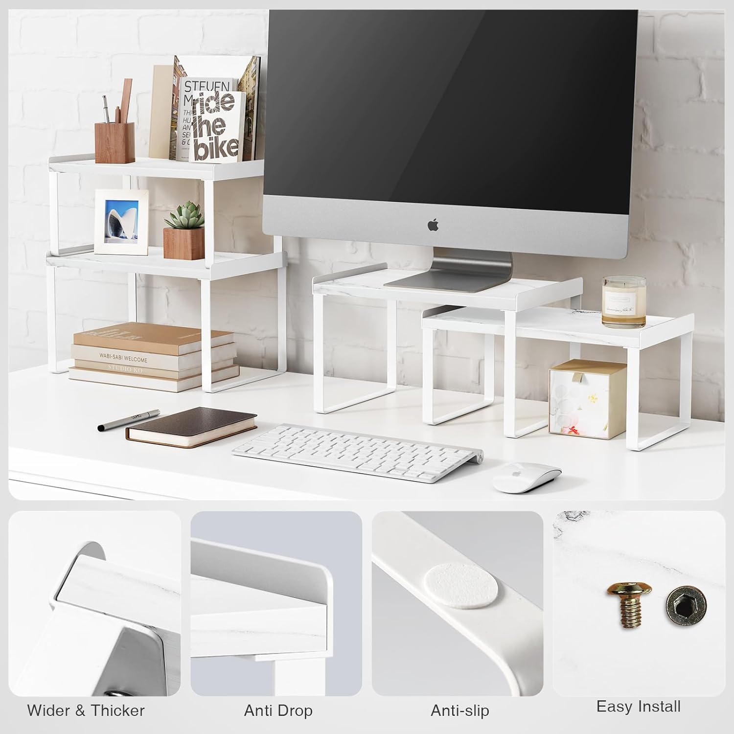 White Marble Kitchen Counter Shelf Organizer, Modern Dish Plate Organizer for Cabinet Space Saver, Small Wood Stackable 2 Tier Office Desktop Shelf Risers for Books Monitor - Set of 4