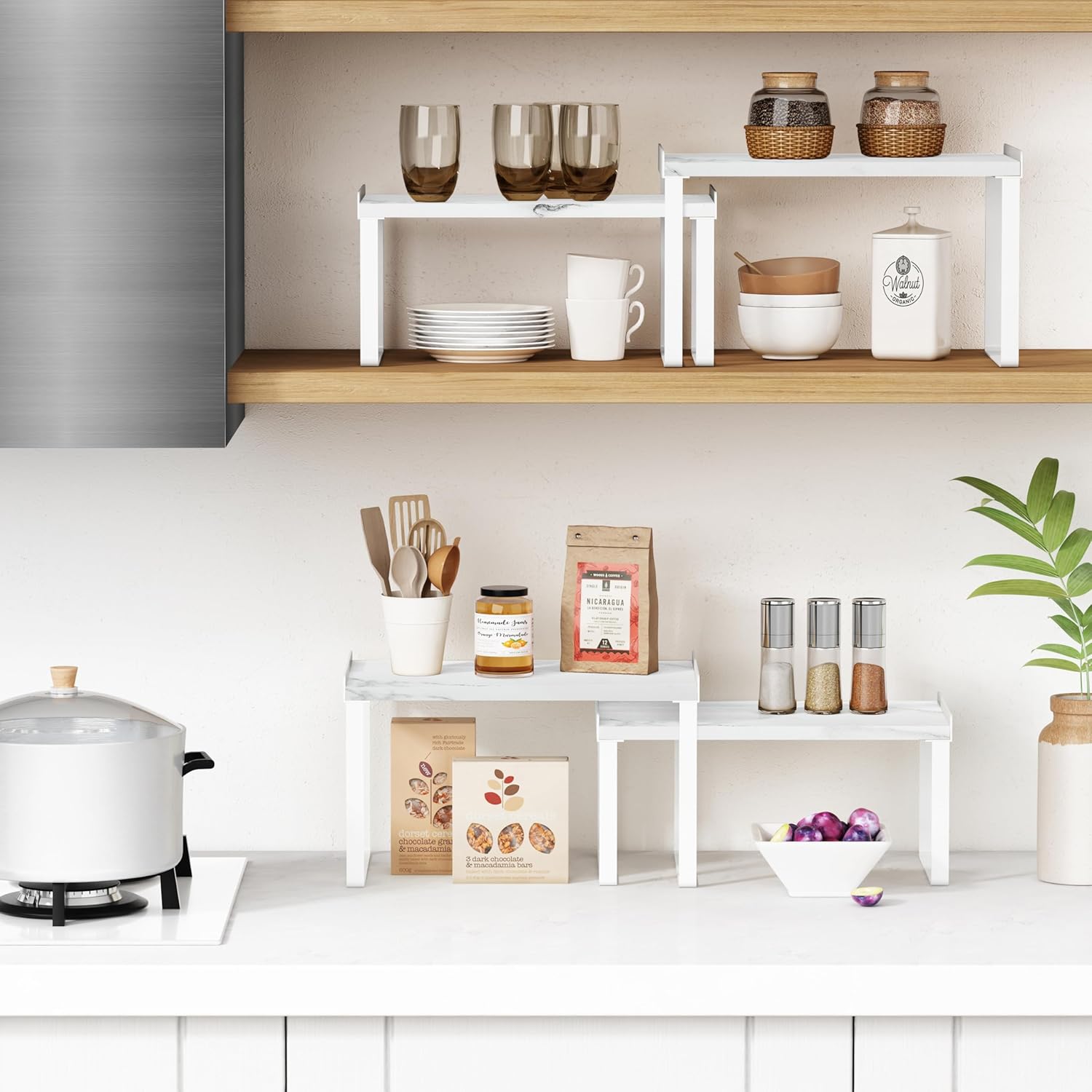 - 【Versatile Shelf Riser Organizer】This kitchen counter shelves are useful kitchen organization and storage tools to organizer messy items in your cabinet, pantry, cupboard, kitchen counter corner, coffee bar, etc. The shelf organizer can also be used outside the kitchen, as table shelf stand for your monitor on home office and so on.
