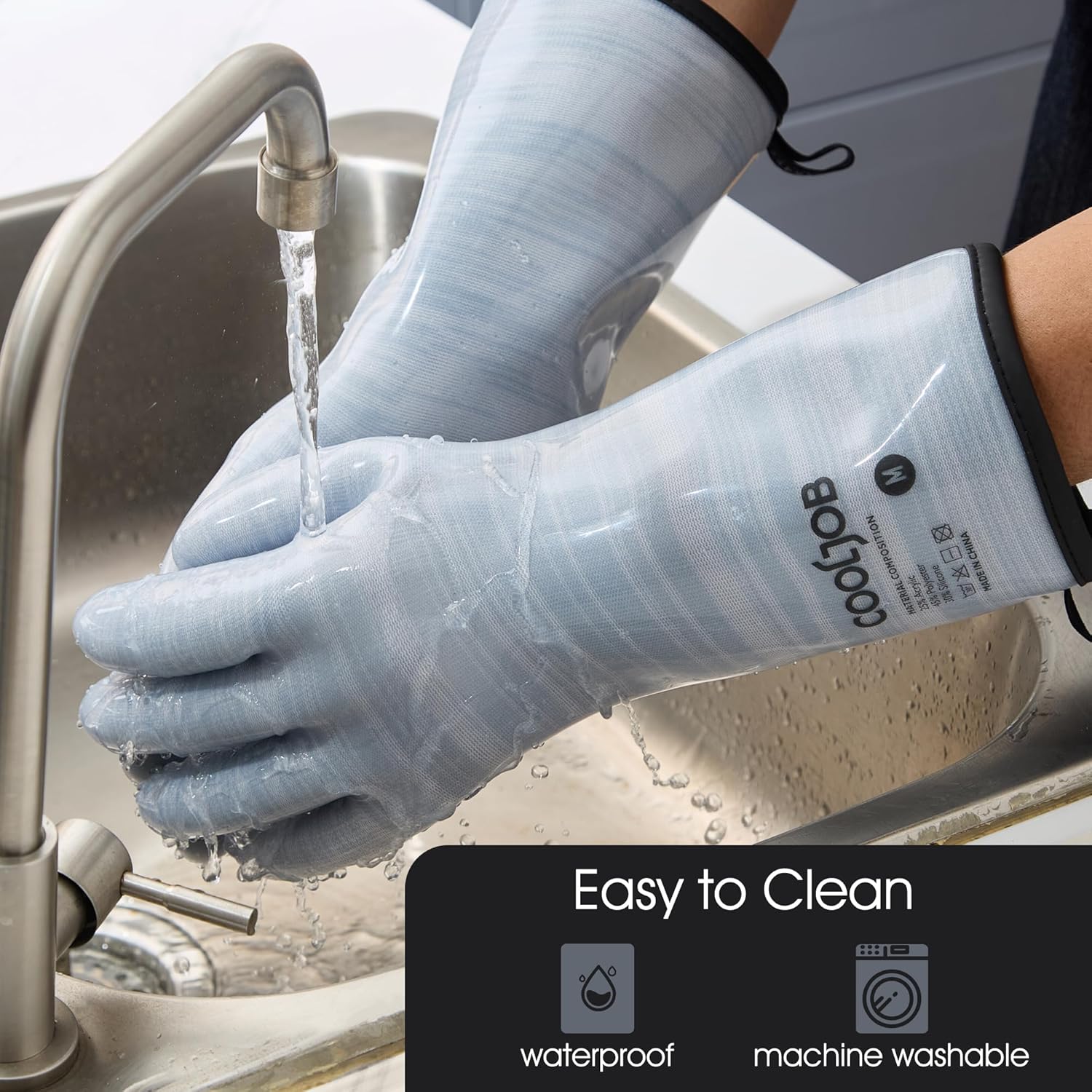- High Quality Liquid Silicone Gloves: The kitchen gloves are made of Food Grade odorless silicone. With 13-inch sleeve, the gloves provide perfect protection for your hands and arms, defense against hot water and steam.