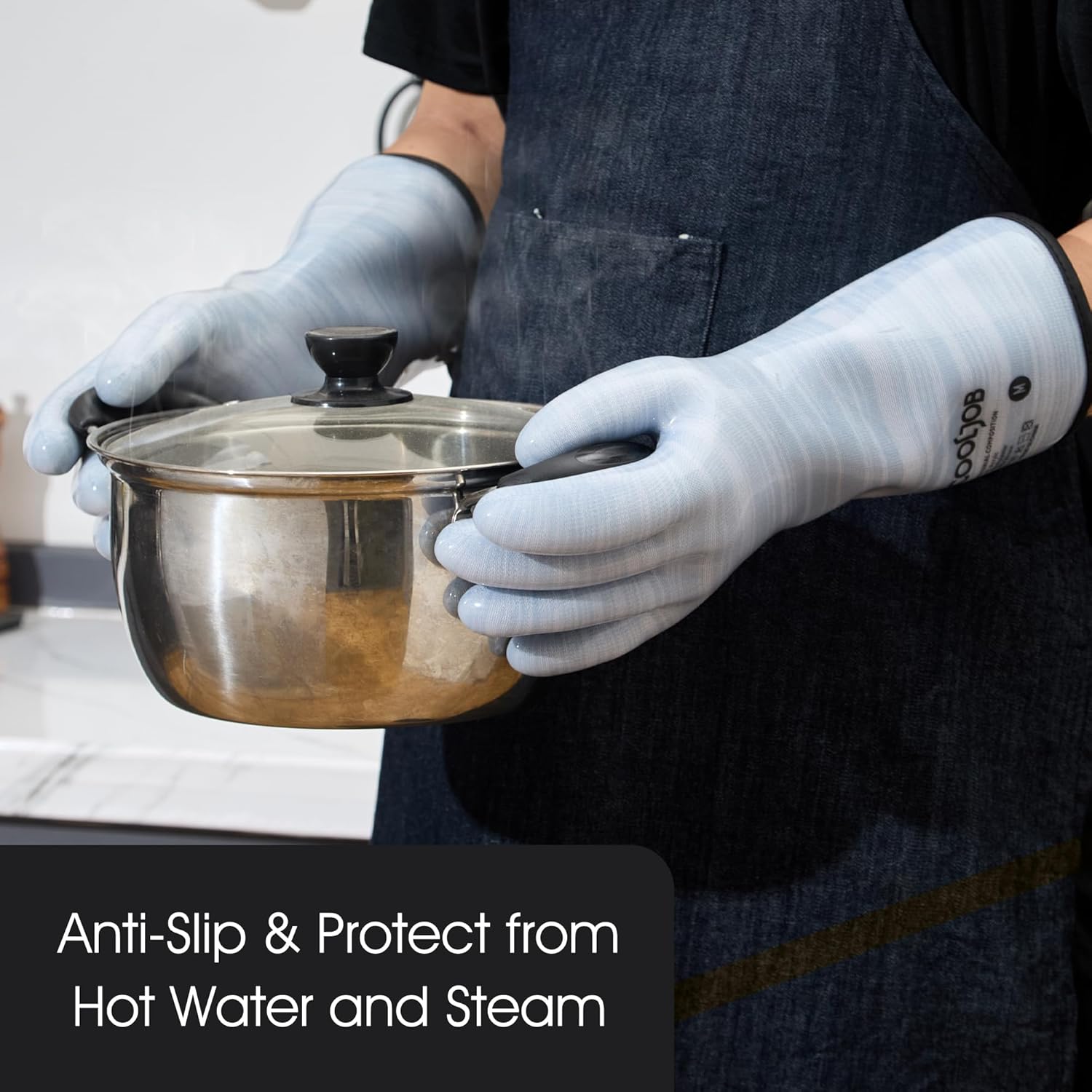 - High Quality Liquid Silicone Gloves: The kitchen gloves are made of Food Grade odorless silicone. With 13-inch sleeve, the gloves provide perfect protection for your hands and arms, defense against hot water and steam.