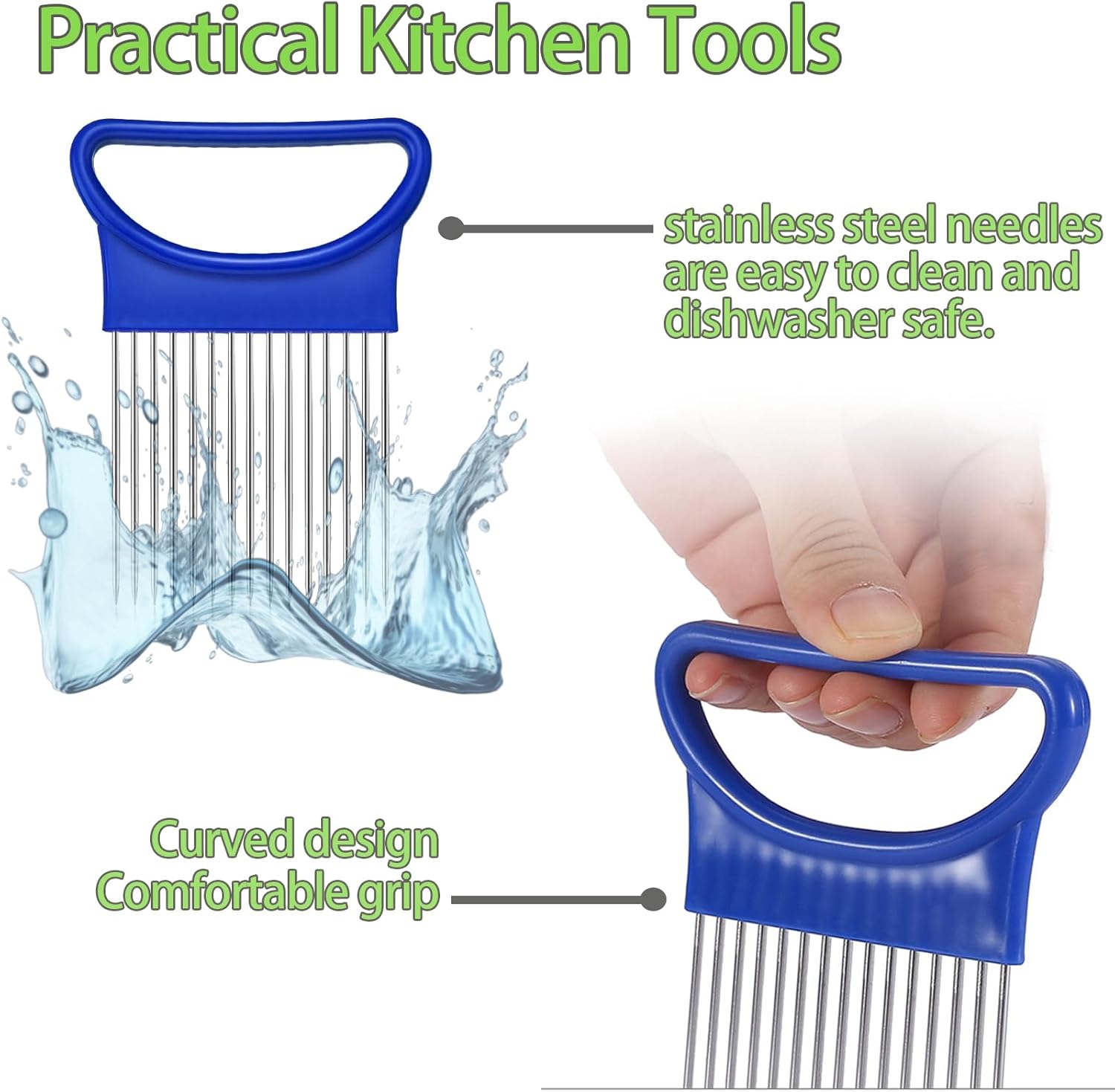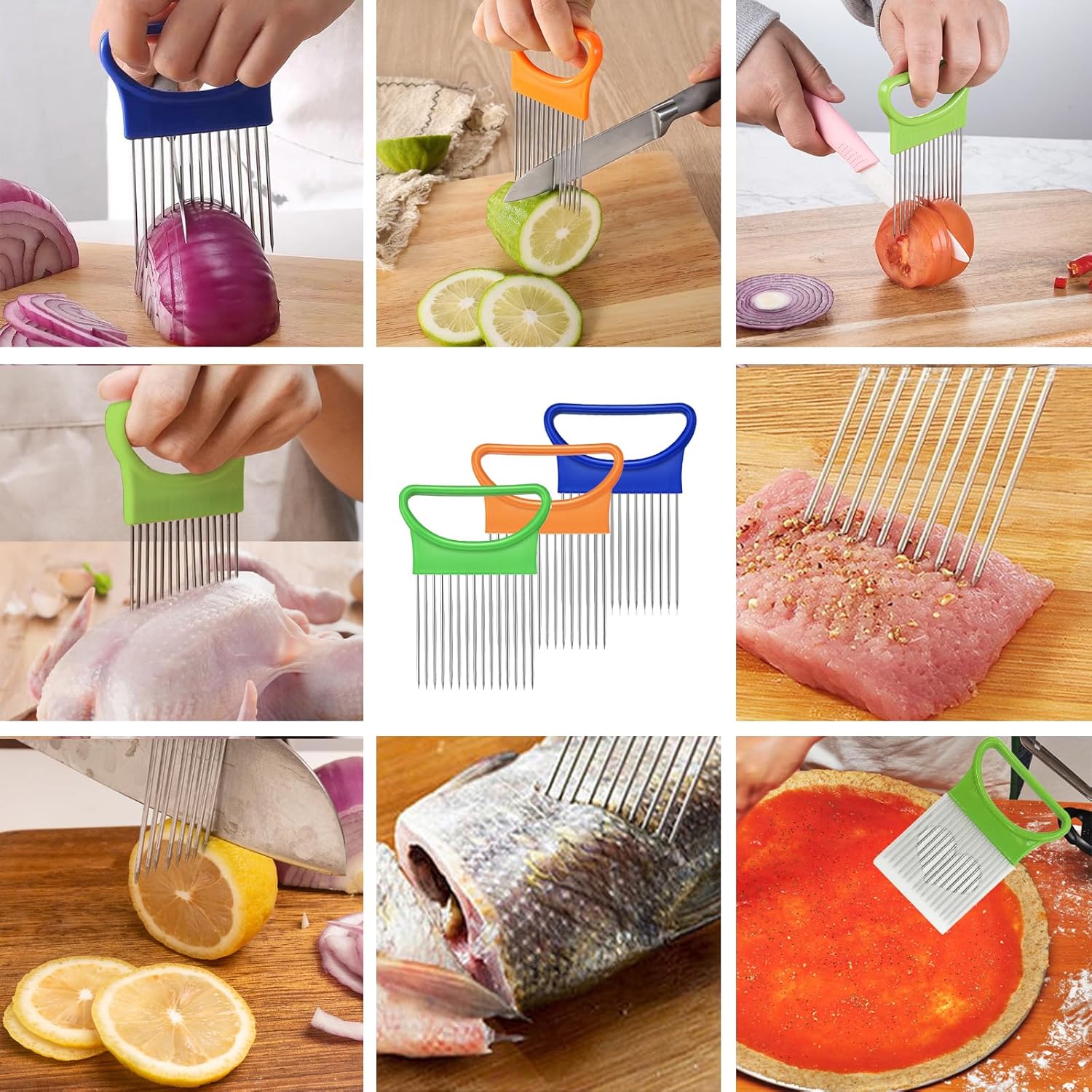 - Multi-purpose kitchen gadgets: You will get three different coloured onion cutter for slicing, which can be used on different foods. hasselback potato slicer can be used for slicing all kinds of vegetables, fruits and meats, such as onions, lemons, cheeses, potatoes, tomatoes, apples, steaks, chicken, carrots, eggs, cucumbers, etc. Fruits, vegetables and meats. slicer tomato is also a great meat tenderiser, with sharp steel needles that penetrate deep into the meat to improve its texture