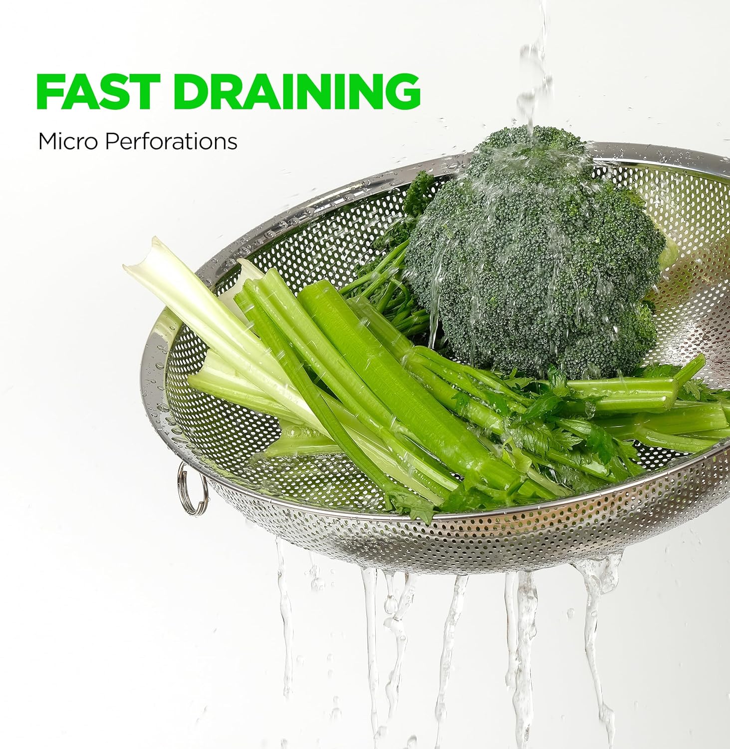 - MICRO-PERFORATED FOR EFFICIENCY: Designed with micro-perforations, our colander offers superior durability and efficiency over traditional designs. Perfect for washing a variety of foods, its high-quality 304 stainless steel construction ensures long-lasting performance. The fine perforations allow for efficient drainage, making it a practical addition to any kitchen.