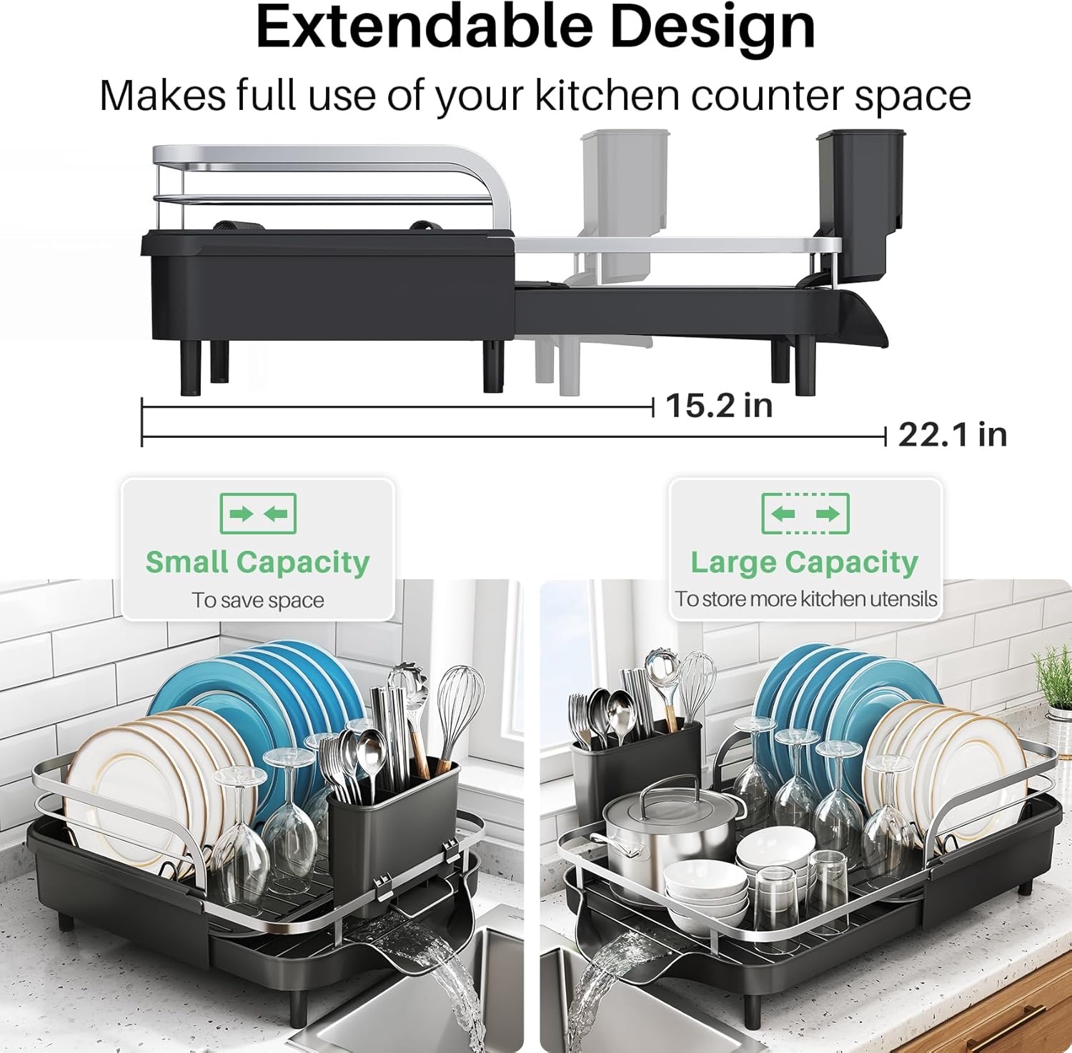 - Expandable Design: SNTD's dish drying rack adapts to your kitchen—its width flexes from 15.2" to 22.1", making it a game-changer for small kitchens or apartments. Tight on space? Retract it to fit compact counters. Post-dinner rush with stacks of dishes? Extend for all the extra drying room you need