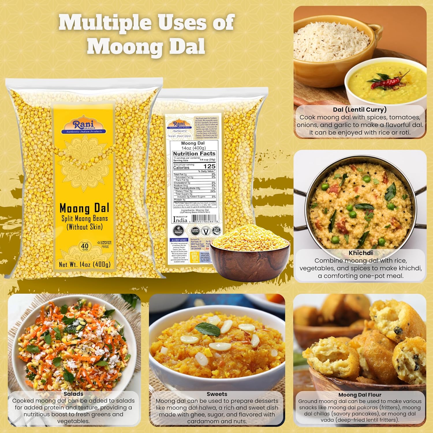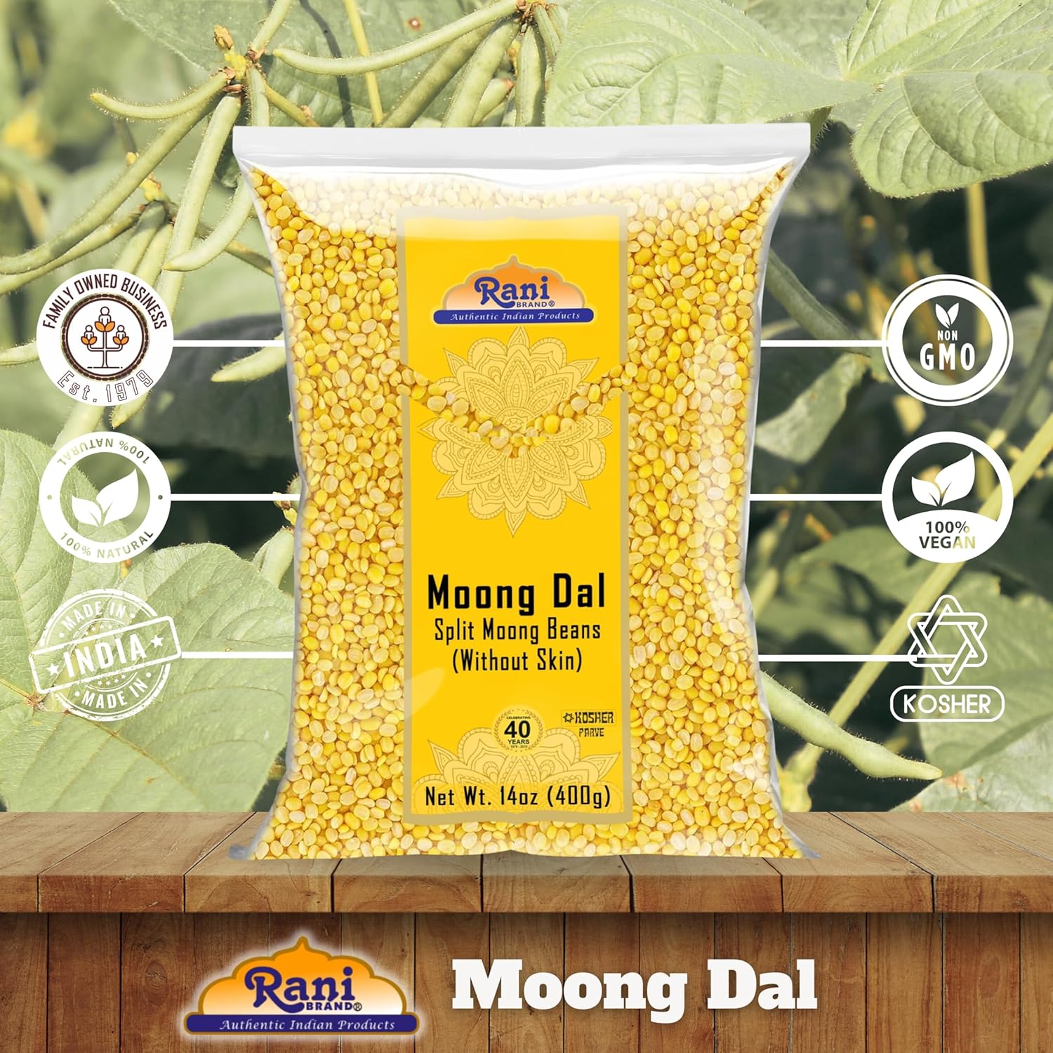 Rani Moong Dal (Split Mung Beans Without Skin) Lentils Indian 14oz (400g) ~ All Natural | Gluten Friendly | Non-GMO | Kosher | Vegan | Indian Origin
