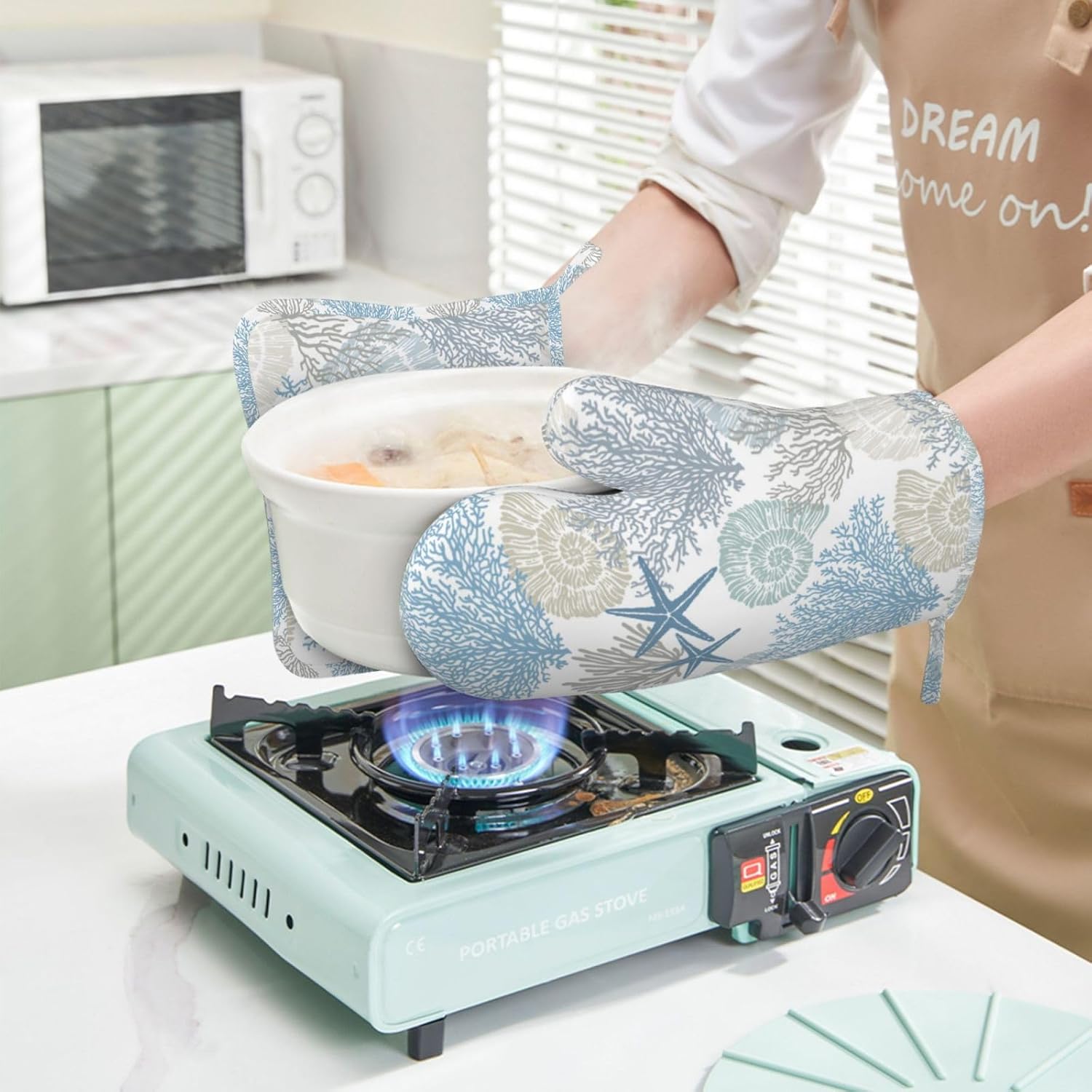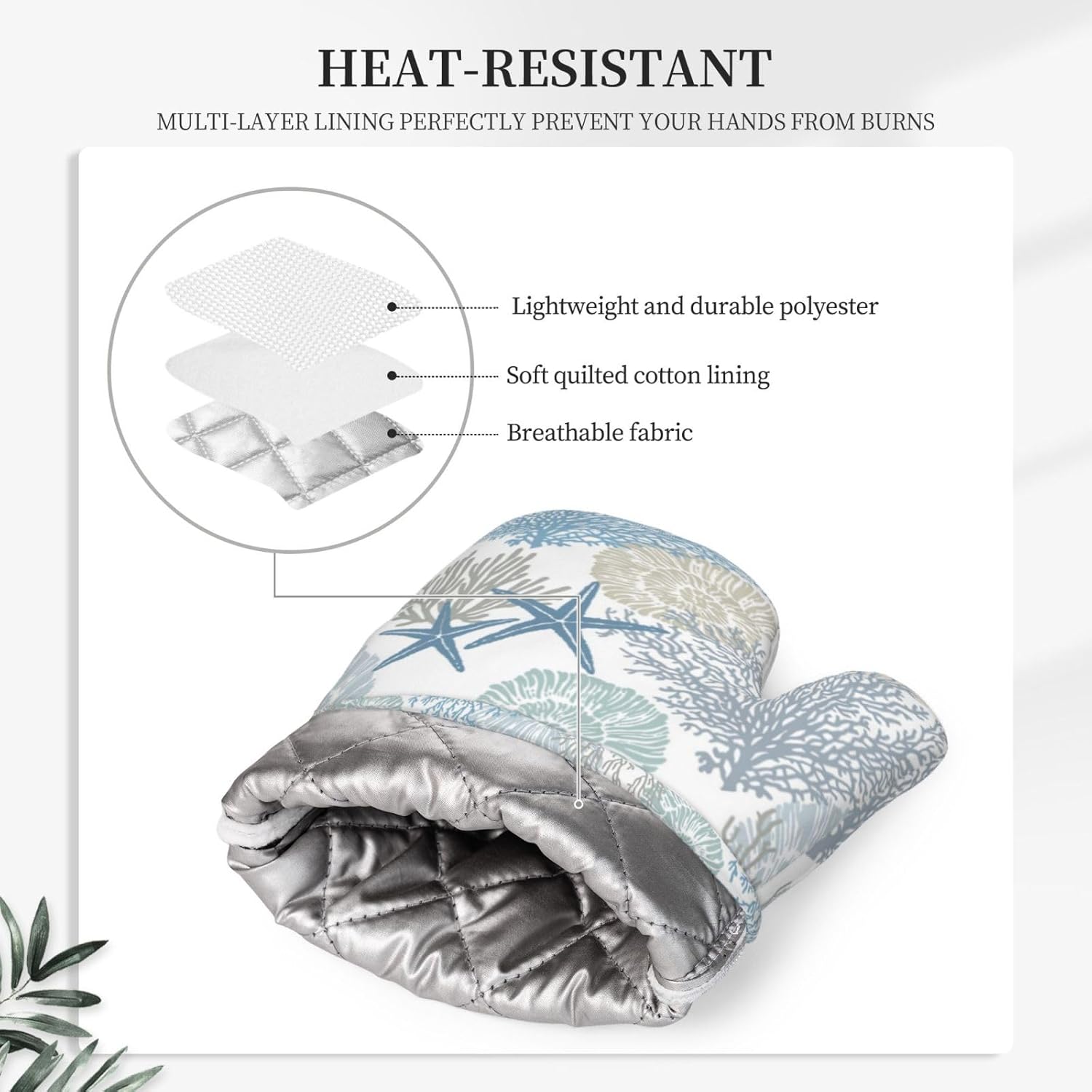 - MATERIAL: Made of high-quality silicone and polyester, our marine plants and animals print oven mitts offer a durable and non-slip grip design that provides a secure hold on pots and pans. The soft and thick quilted lining adds extra comfort while you're cooking. Make cooking in your kitchen safer and more convenient.