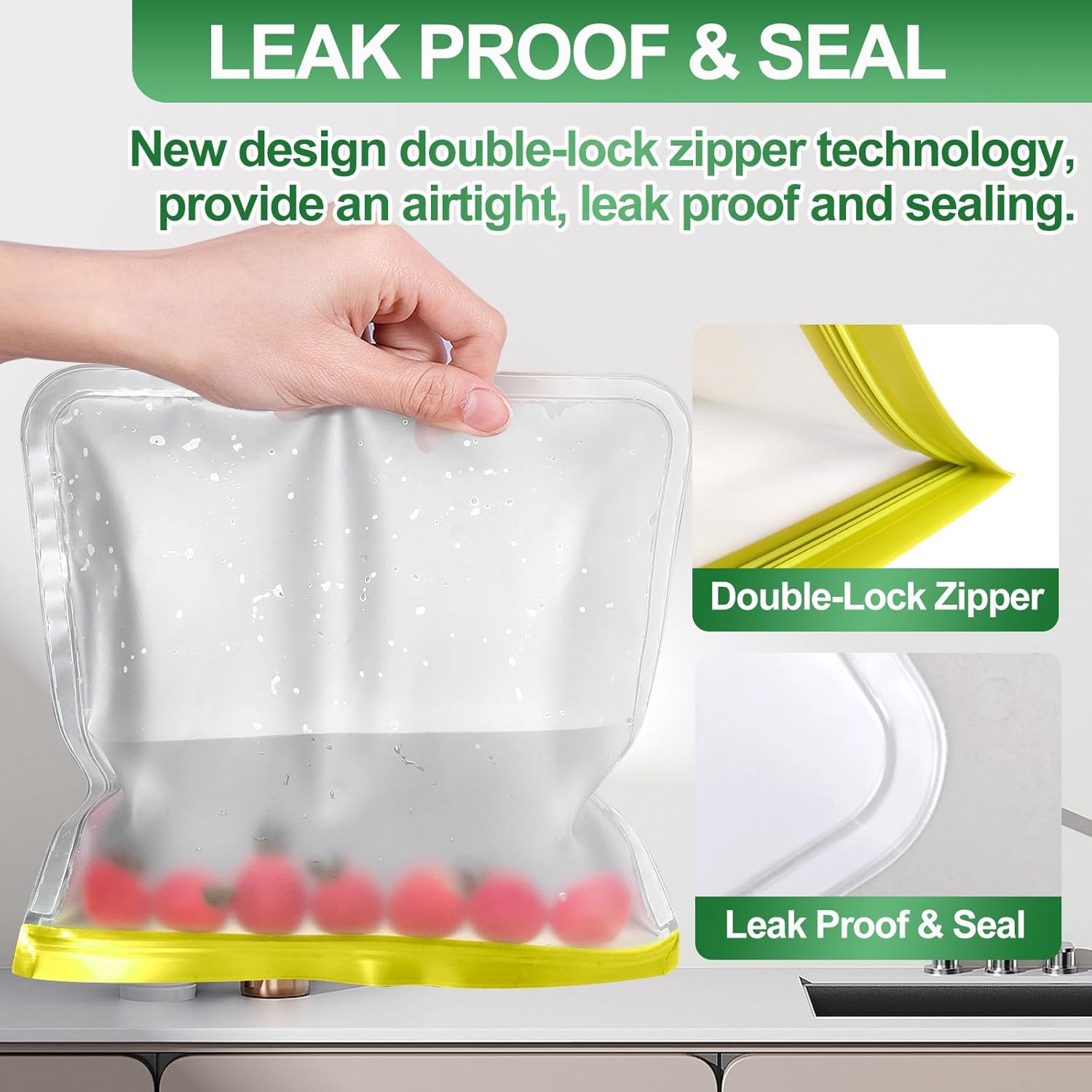 - [LEAK-PROOF & EASY SEAL] Upgraded double closures ensure an airtight, leakproof seal, making these reusable freezer bags perfect for storing and preserving food. The widened sides and non-slip zipper design allow for easy opening and closing of the freezer bags.