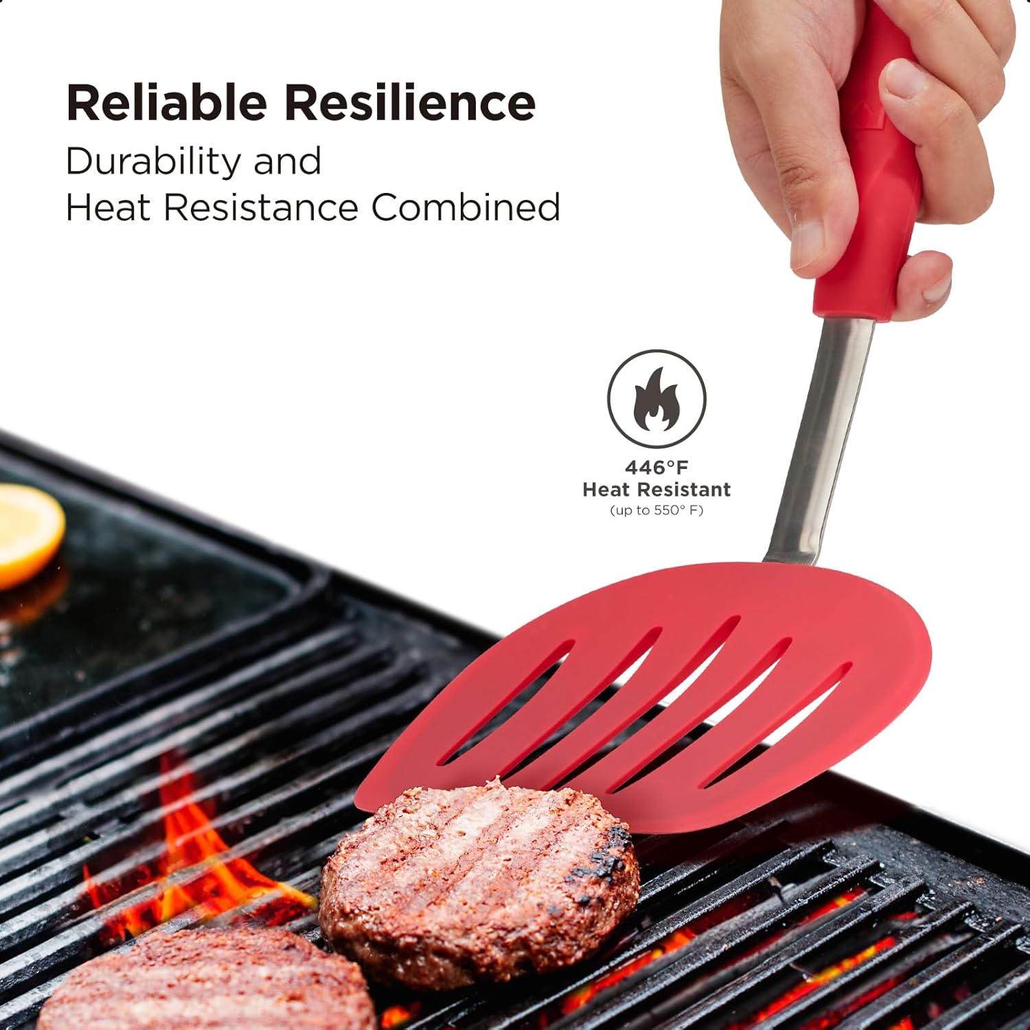 Kitchen Mama WaltzGrip Platinum Silicone Pancake Spatula Turner: Heat Resistant Flexible, Stainless Steel Core, Nonstick, Dishwasher Safe, Flipper – Ideal Kitchen Cookware for Eggs, Fish, Meat (Red)