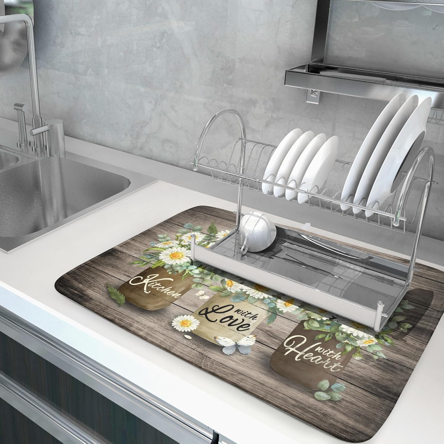- 【Protect Tableware】Place your dishes on it or under dish racks, the daisy floral dish mat prevents bowls, glassware, and more tablewares from being scratched or worn, can be used as dish drying mat, sink mat, dishes drainer mats to keep the countertop dry and tidy.
