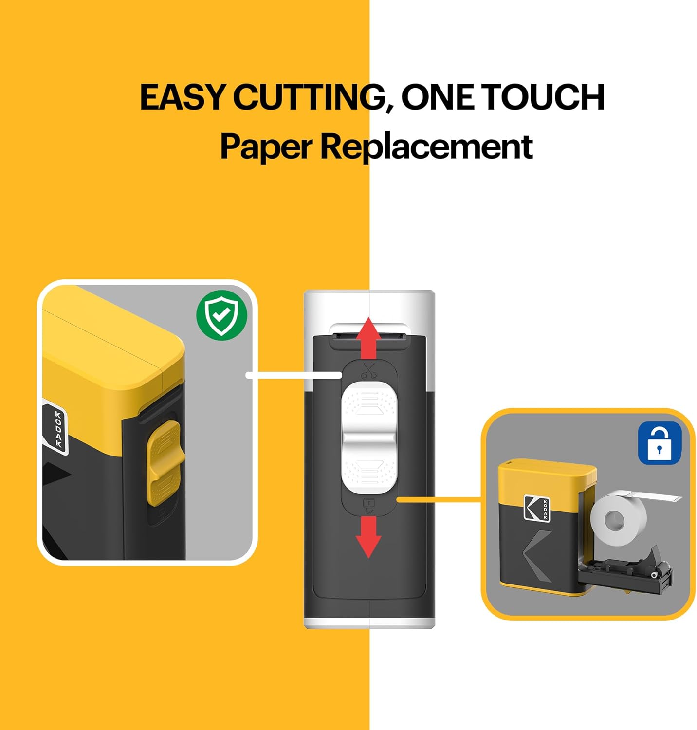 - [ Safe for use ] Unlike conventional label makers, KODAK Label printer has the cutting blade positioned inside, allowing for safe label cutting without the risk of hand injury. You don't need to worry even if your kids uses the label maker alone!