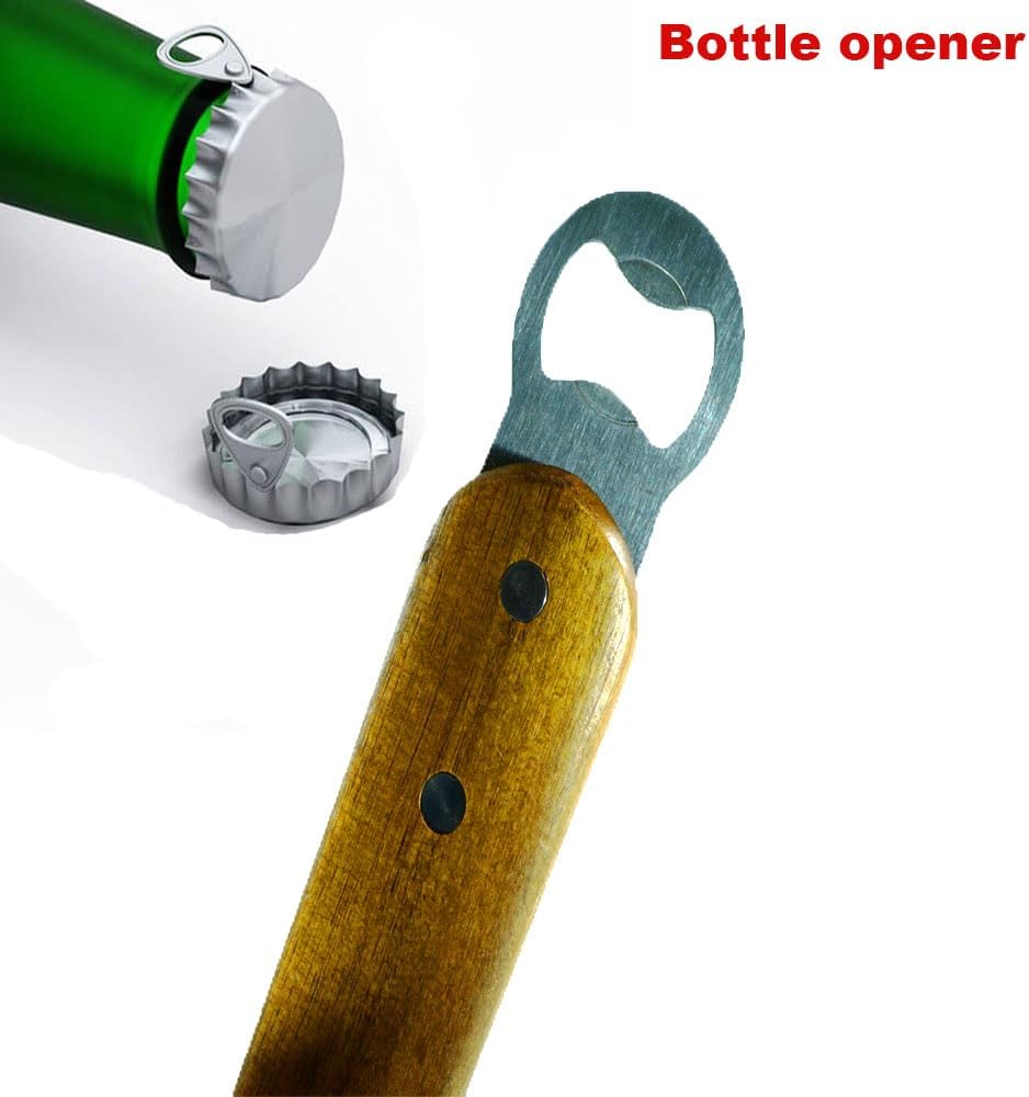 - BBQ utensils for easy handling! The 4-in-1 BBQ Spatula (with Spatula Tongs Cutter Bottle opener, function) and Meat Fork in our BBQ Utensils are both 16 in .5OZ, providing plenty of range, comfort and durability. No small, flimsy grilling tools here!