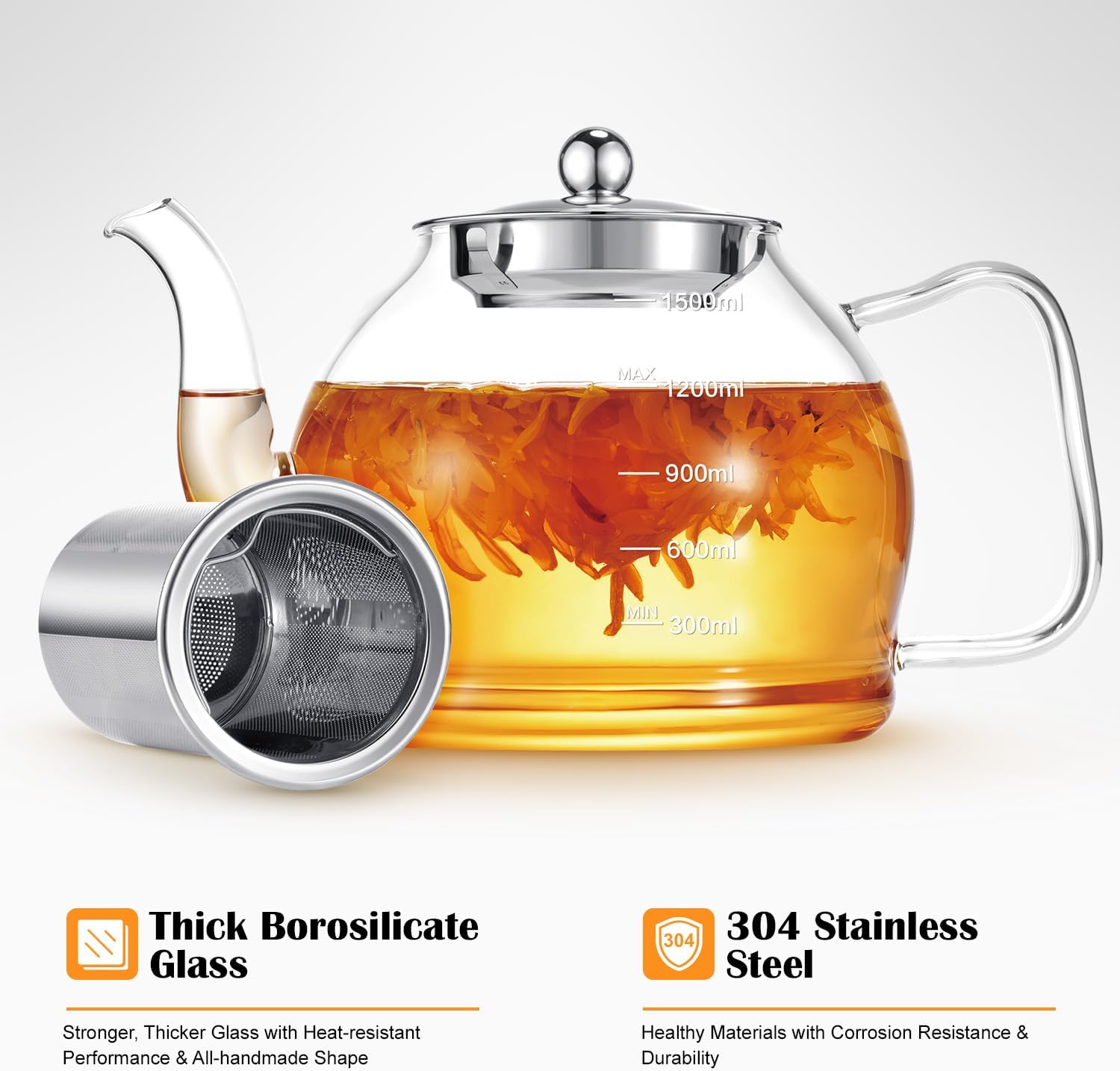 STNTUS Glass Teapot, 52 oz / 1500 ml for Loose Tea, Teapot with Infusers for Loose Tea, Stainless Steel Strainer, Tea Pot for Stove,