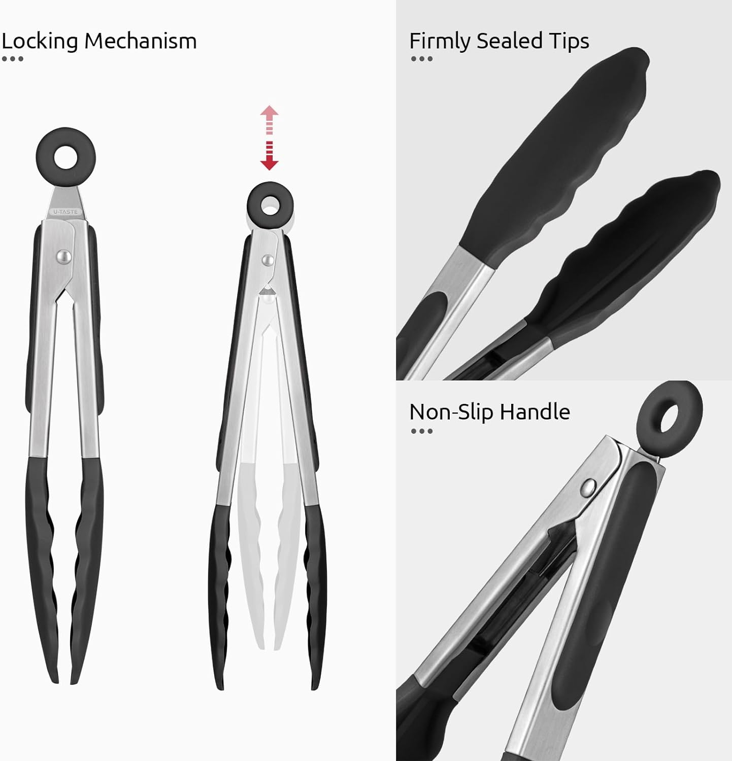 600ºF Heat Resistant Kitchen Tong: U-Taste 7 inch Silicone Cooking Tong with Firm Sealed Non Stick Rubber Tips & Silicon Coated 18/8 Stainless Steel Handle & Smooth Locking for Serving Salad (Black)