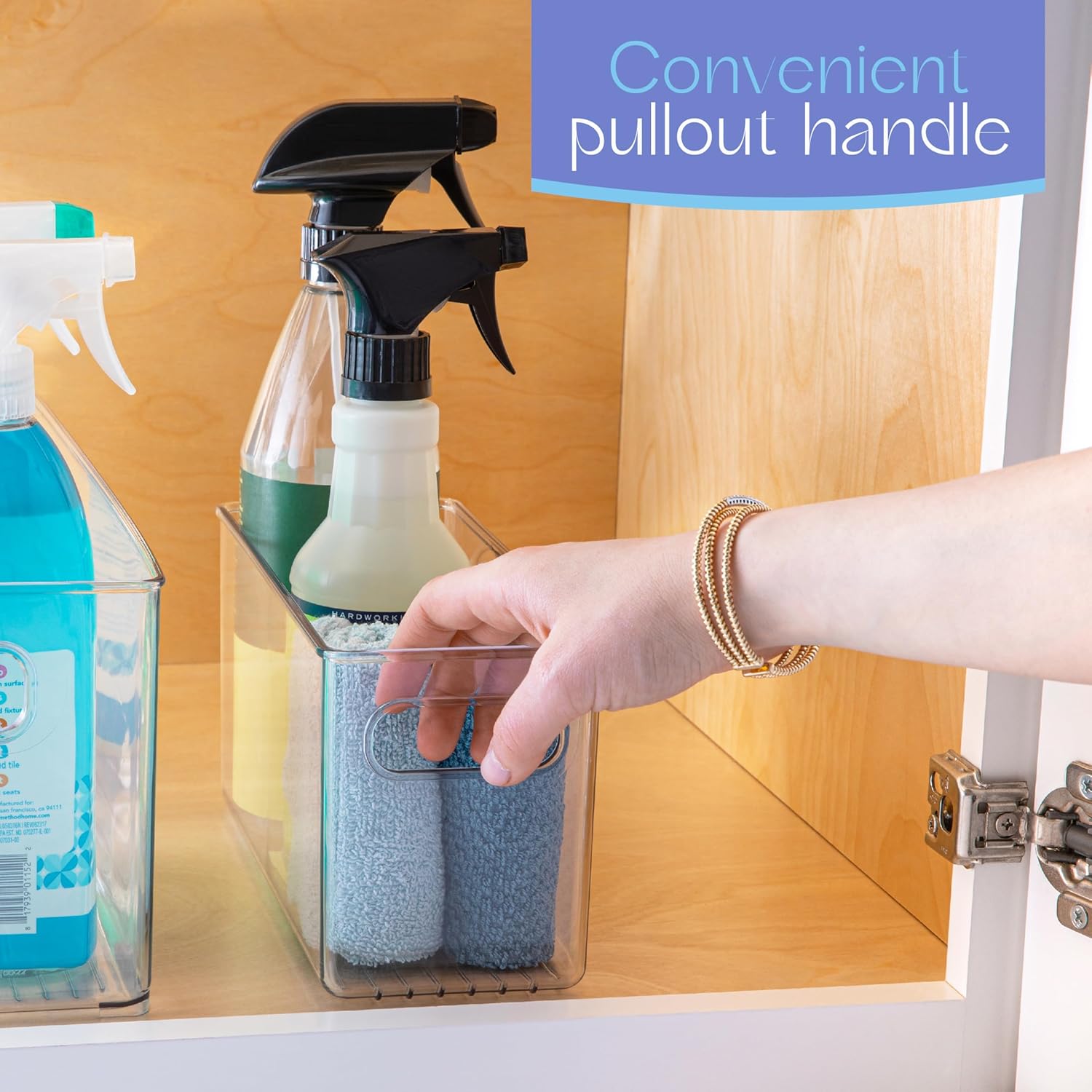 Plastic Food Storage 6 Pack Clear Container Bin with Handles for Organizing Kitchen, Pantry, Refrigerator, Freezer, Pantry, Cabinet, Closet, Bathroom. 10”x4”x5”