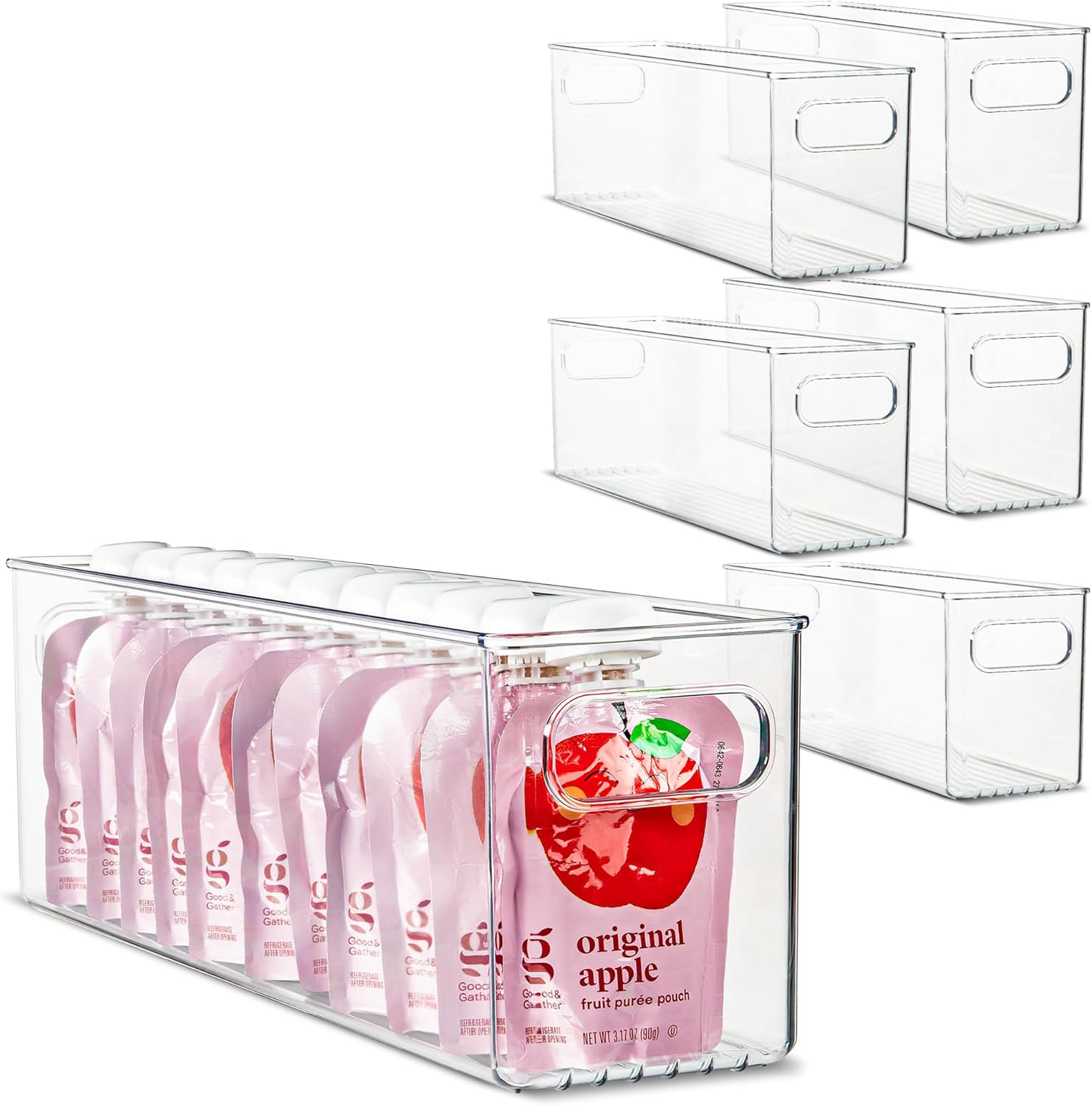 - Perfect for organizing: These bins are perfect for creating calm, clean and organized spaces. Great for upper cabinets & pantry shelves, for organizing fridge/freezer, pantry, cabinet storage, medicine cabinet or anywhere in your home. Ideal to use for yogurts, baby food, pouches, cans, dry goods, snacks, fresh fruits and vegetables, potatoes, apples, boxed foods, juices, drink boxes.