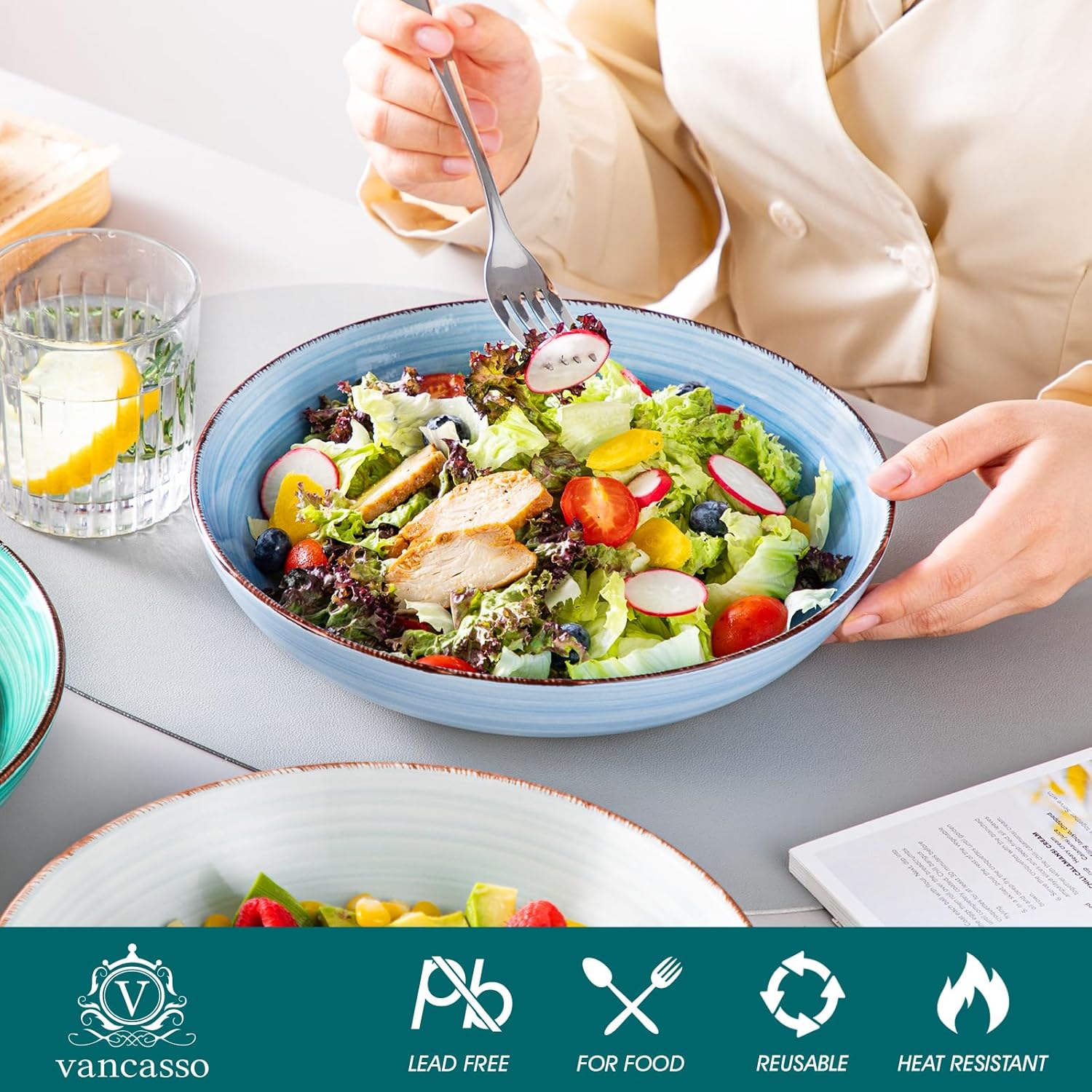 vancasso Bonita Pasta Bowls Set of 6, 50oz Large Salad Bowls for Kitchen, Stoneware Serving Bowls Dishwasher & Microwave Safe, Blue Bowl Set