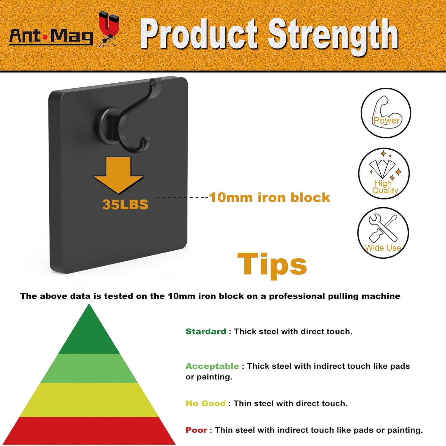 - 【REINFORCED MAGNET】Ant Mag magnetic hooks are made of the strong neodymium magnet, which produces an intensive force of attraction that holds up to amazing 140lbs on vertical hanging and 35lbs on horizontal hanging.