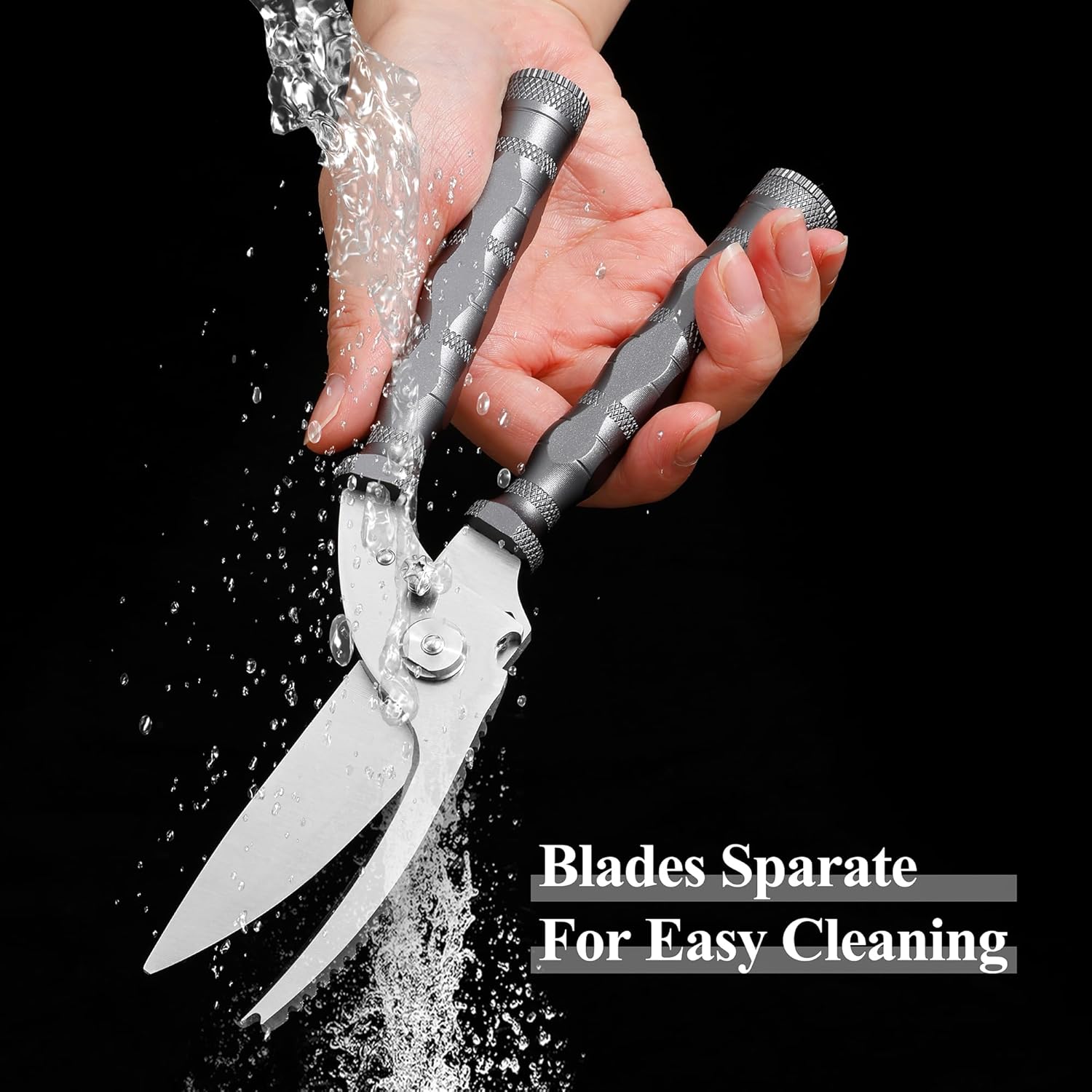 - 【Premium quality ultra-sharp Poultry shears】The high-quality kitchen poultry shears forged from premium stainless steel are sharper and thicker. Kitchen scissors are a professional heavy-duty kitchen scissors with a quick and easy detachable structure where one blade can be turned into a knife. The detachable blade also makes cleaning easier and does not leave a stain on the scissors.