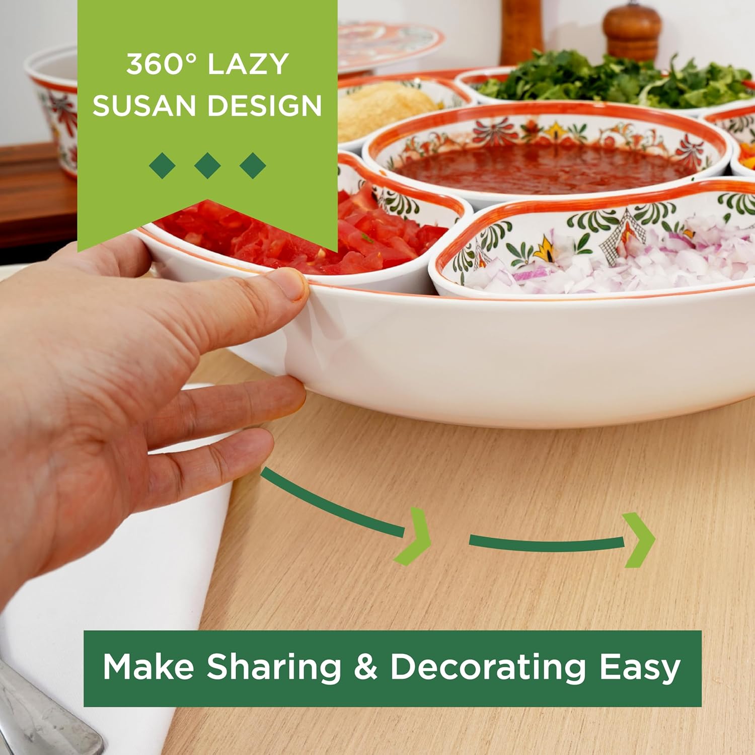 - Taco Serving Platter Details: Experience the ultimate convenience with our 15" 360° rotating platter, which includes five 7.45" ingredient trays and a 6.7" dipping bowl. Together, they offer a maximum capacity of 24.64 ounces, making it perfect for all your serving needs. NOTE: NOT MICROWAVABLE