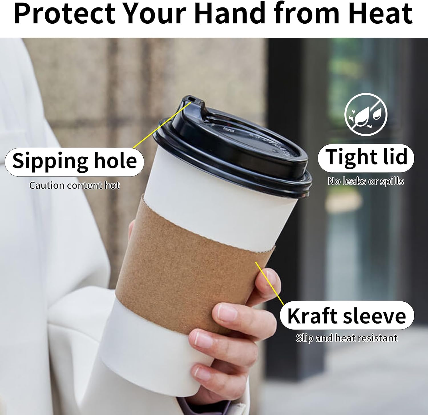 - Premium Value Package: You will receive a valuable package containing 100 thick and sturdy paper cups with 100 leak-proof lids, and 100 protective sleeves, designed to cater to your busy lifestyle without compromising on quality. Ideal for coffee, tea, hot chocolate, and other drinks. The sturdy lid and sleeve combo ensures your drink is easy to hold, sip, and enjoy, without the mess