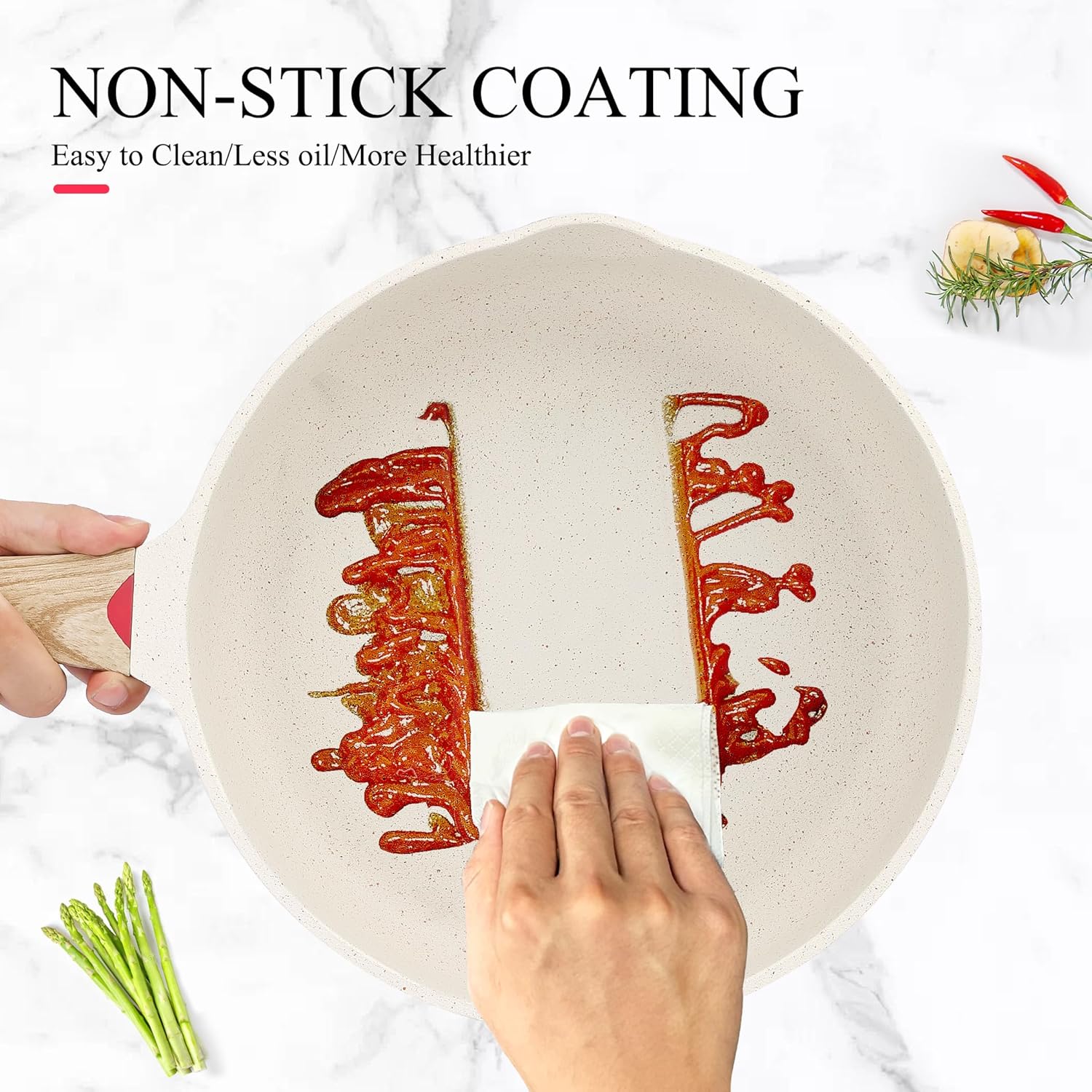 - Frying Pan with Anti-Scratch Technical - Anti-Scratch Technical imported from Germany and turely Non-Stick coating. The slippery, nonstick surface and no rivets design make the frying pan easy to clean in seconds with a towel, soap and warm water. You can use metal utensil,wooden or silicone ones. Recommend Hand Washing to extend the life of pans.