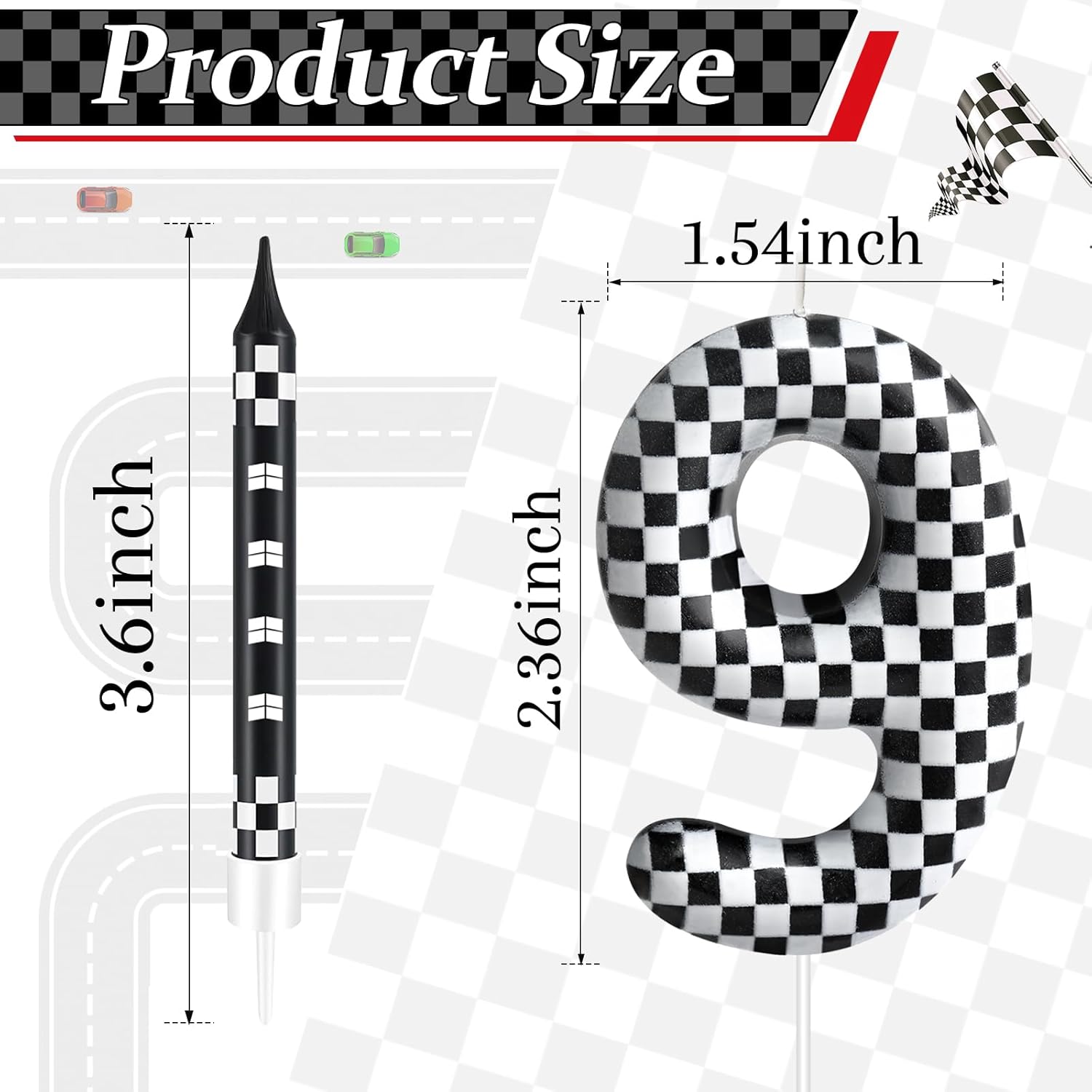 - The Package Includes: You will receive 12 black and white track car themed birthday candles and 1 number 9 black and white checkered candle, Sufficient quantity for birthday cake decoration or party celebration and daily use, note: the candle will slowly melt as it burns, and it is recommended not to leave it on the cake for more than two minutes