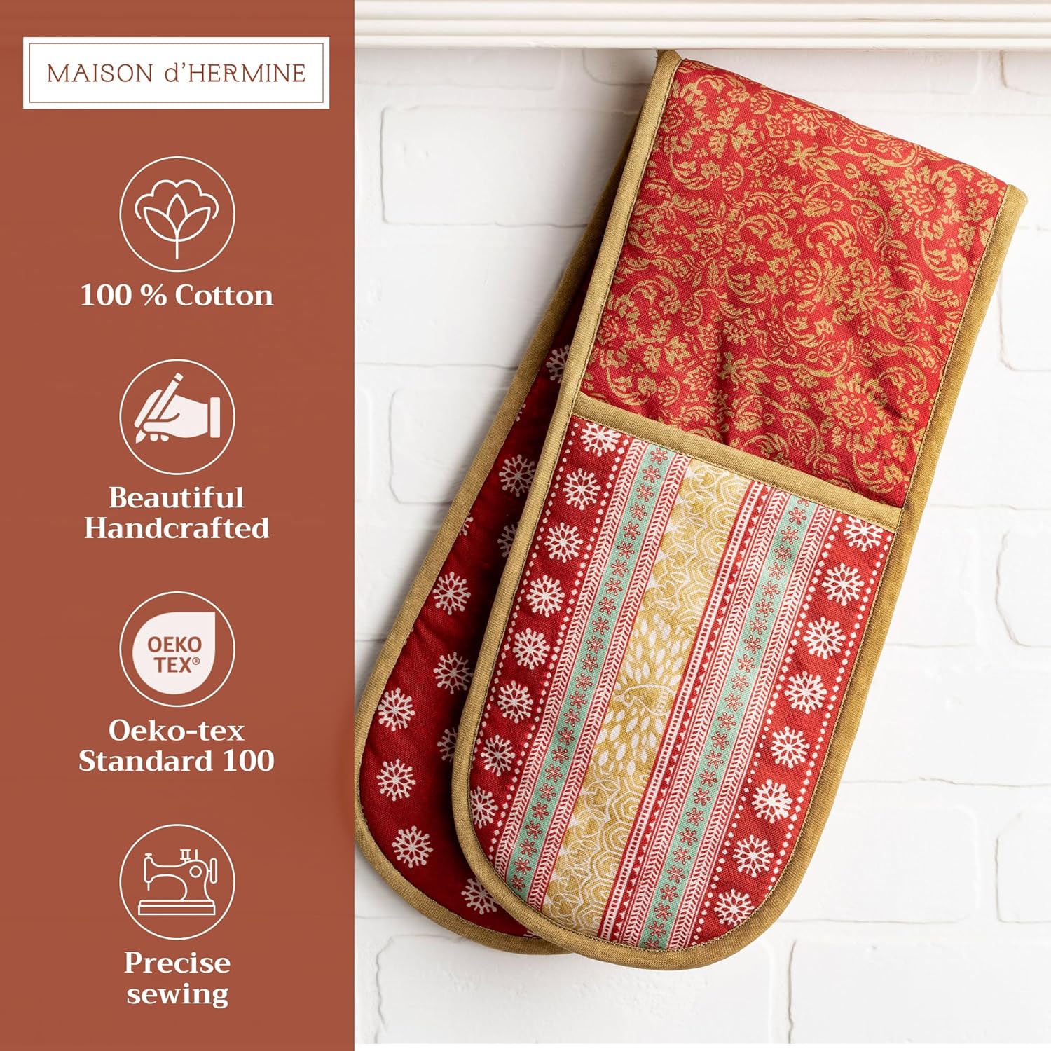 Maison d' Hermine Double Oven Mitts 100% Cotton 7"x35" Double Oven Mitt Heat Resistant BBQ Cooking Gloves with Loop, Baking, Grilling, Home, Kitchen, Handling Hot Pans (Sofia)