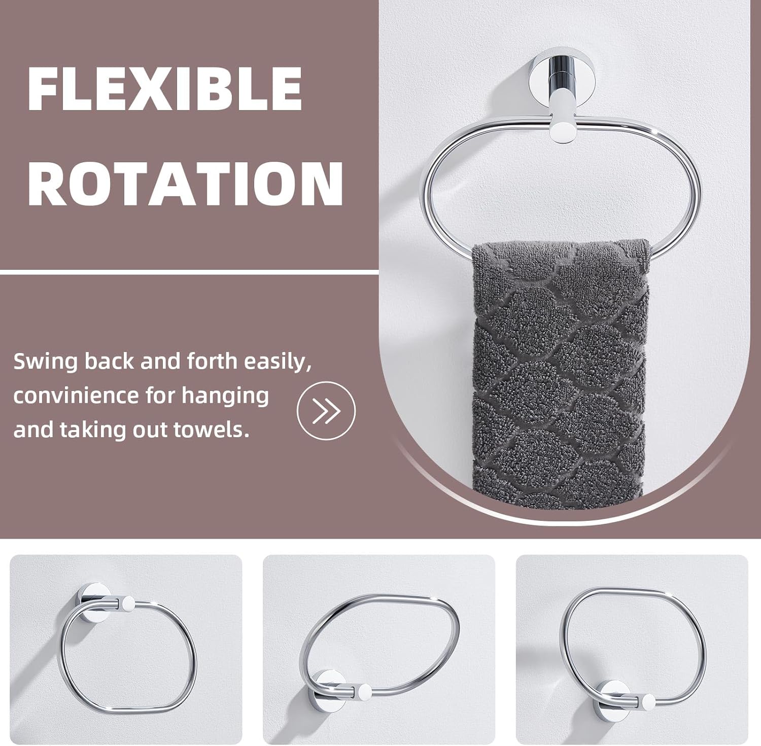 - FUNCTIONAL ROTATABLE RING: towel ring has an unobtrusive gasket at the joint for flexibly and quietly rotating, reducing metal wear and preventing loosening