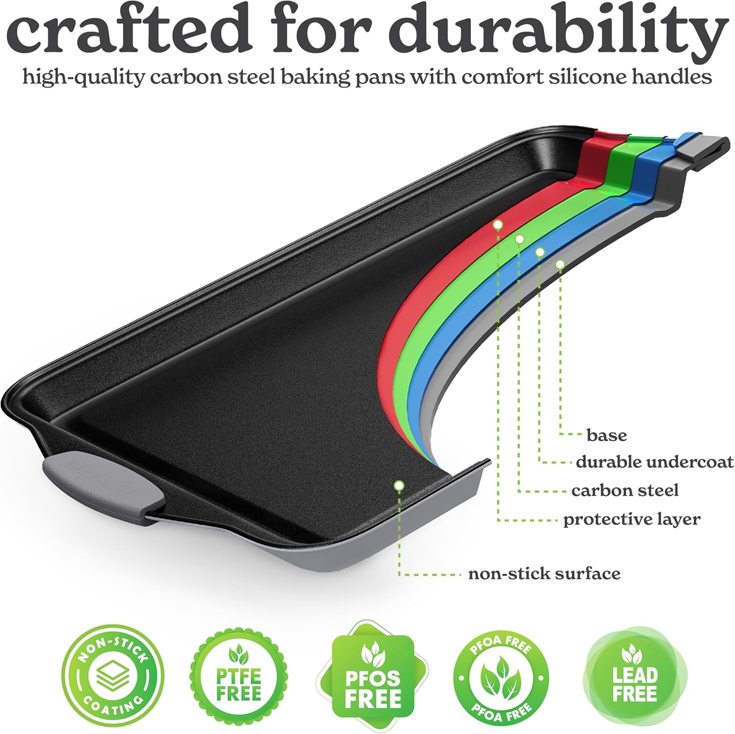 - Silicone Handles: Our bakeware sets non toxic are designed with safety in mind. The silicone handles ensure a secure grip, allowing you to easily and safely move your nonstick baking sheets in and out of the oven.