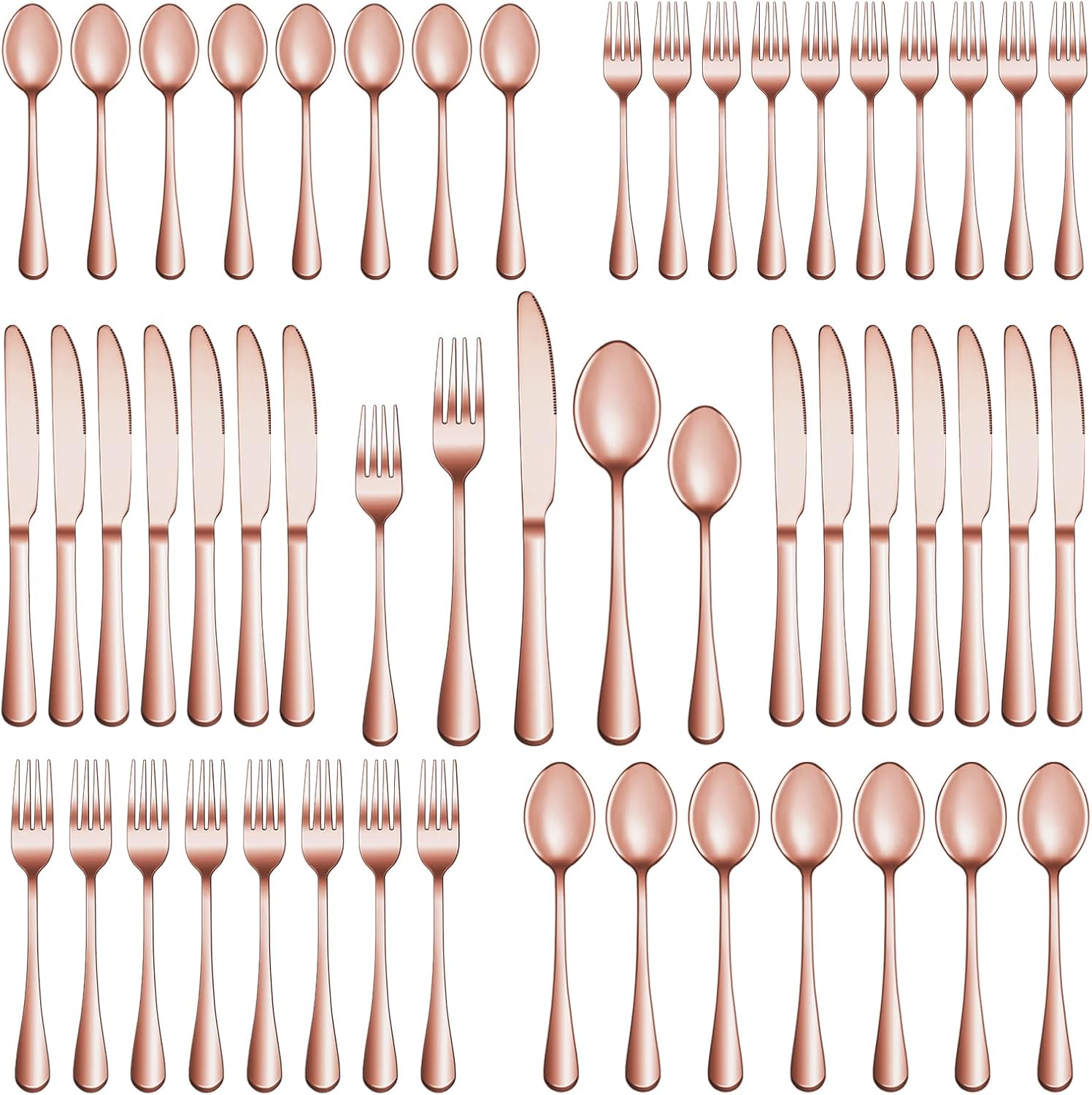 - 60 PCS ROSE GOLD SILVERWARE SET SERVICE FOR 12: This rose gold silverware set comes with 12 Dinner Forks, 12 Dinner Spoons, 12 Dinner Knife, 12 Salad/Dessert Fork and 12 Dessert/Tea Spoons, essential for families or restaurants. The set is also an irreplaceable dining tool whether it is for daily use or for preparing dinners or parties.