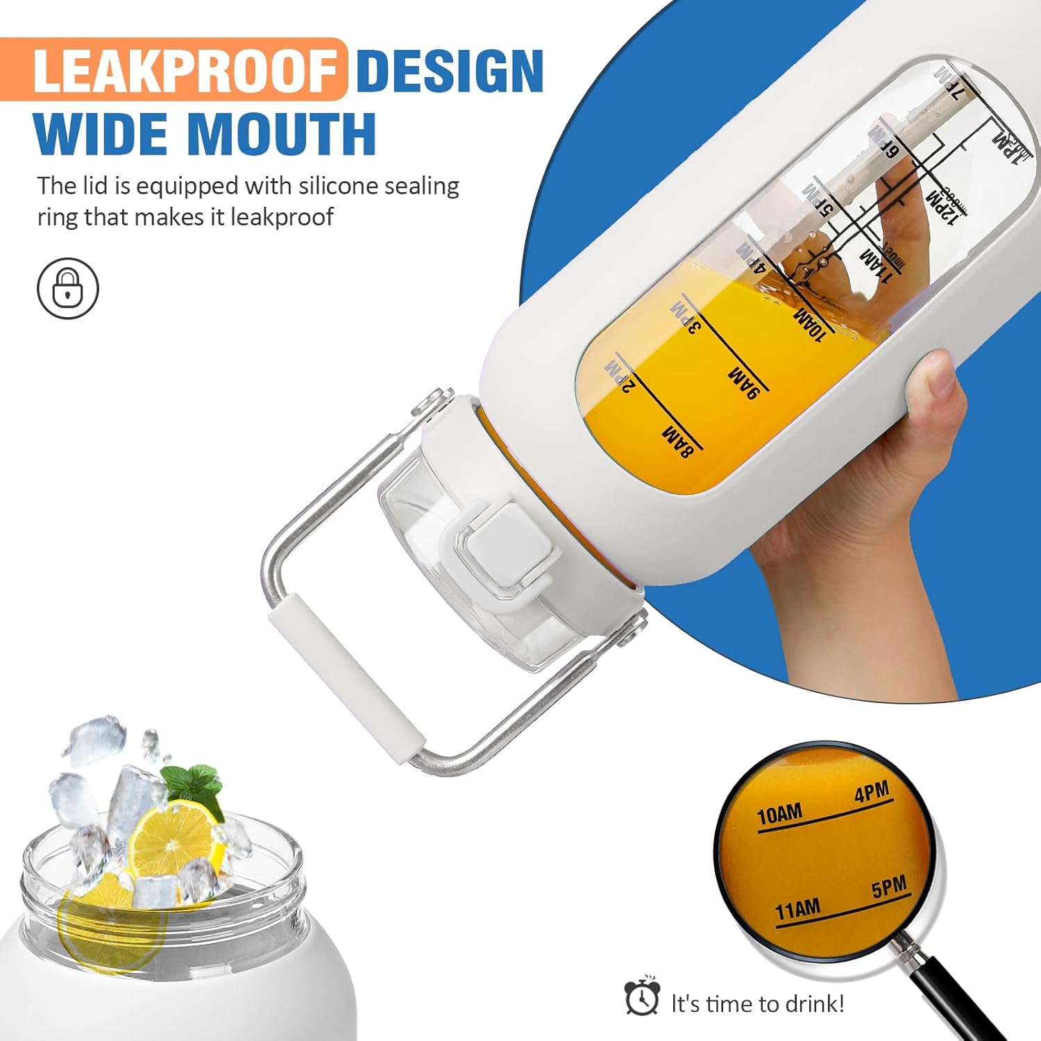 kytffu 64 oz Glass Water Bottle with Straw and Stainless Steel Handle, Half Gallon Water Bottle with Silicone Sleeve and Time Marker, 2L Large Glass Bottle for Gym, School, Travel, Leak-proof (White)