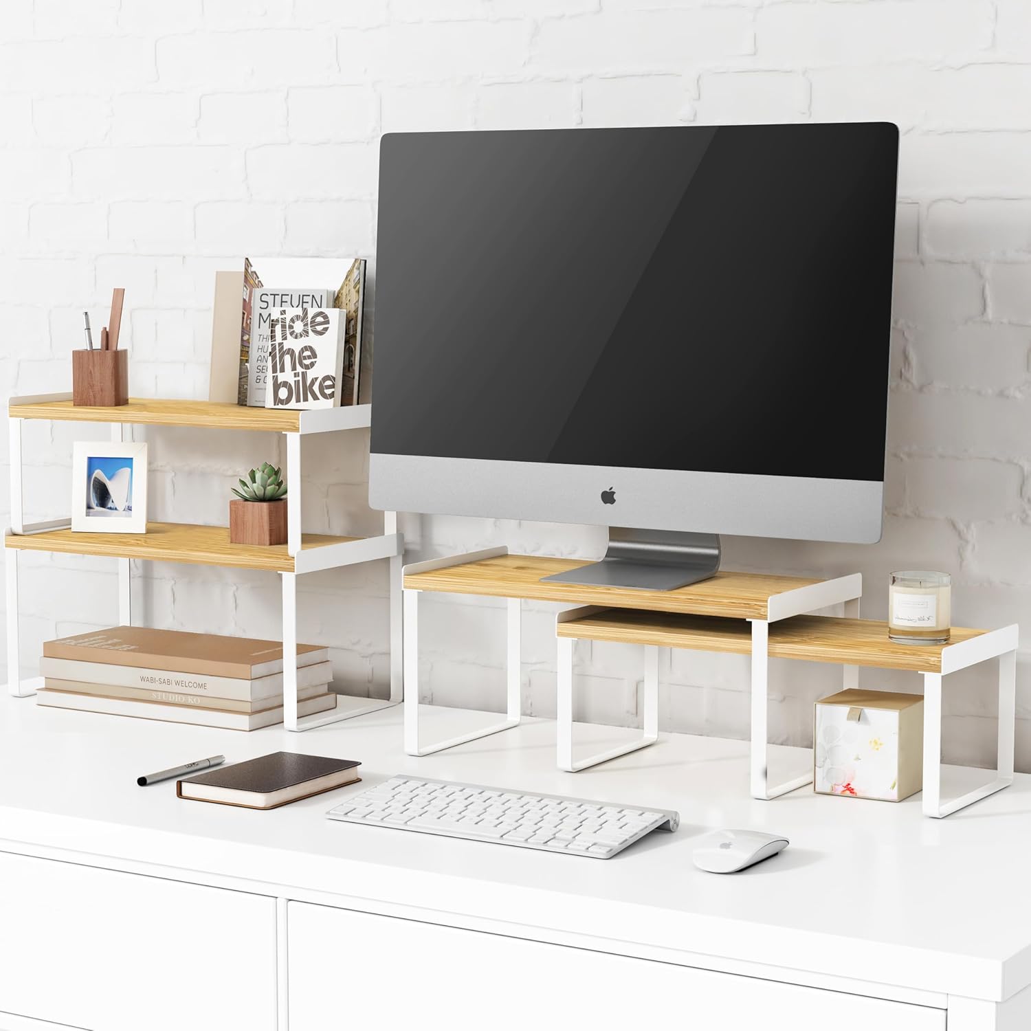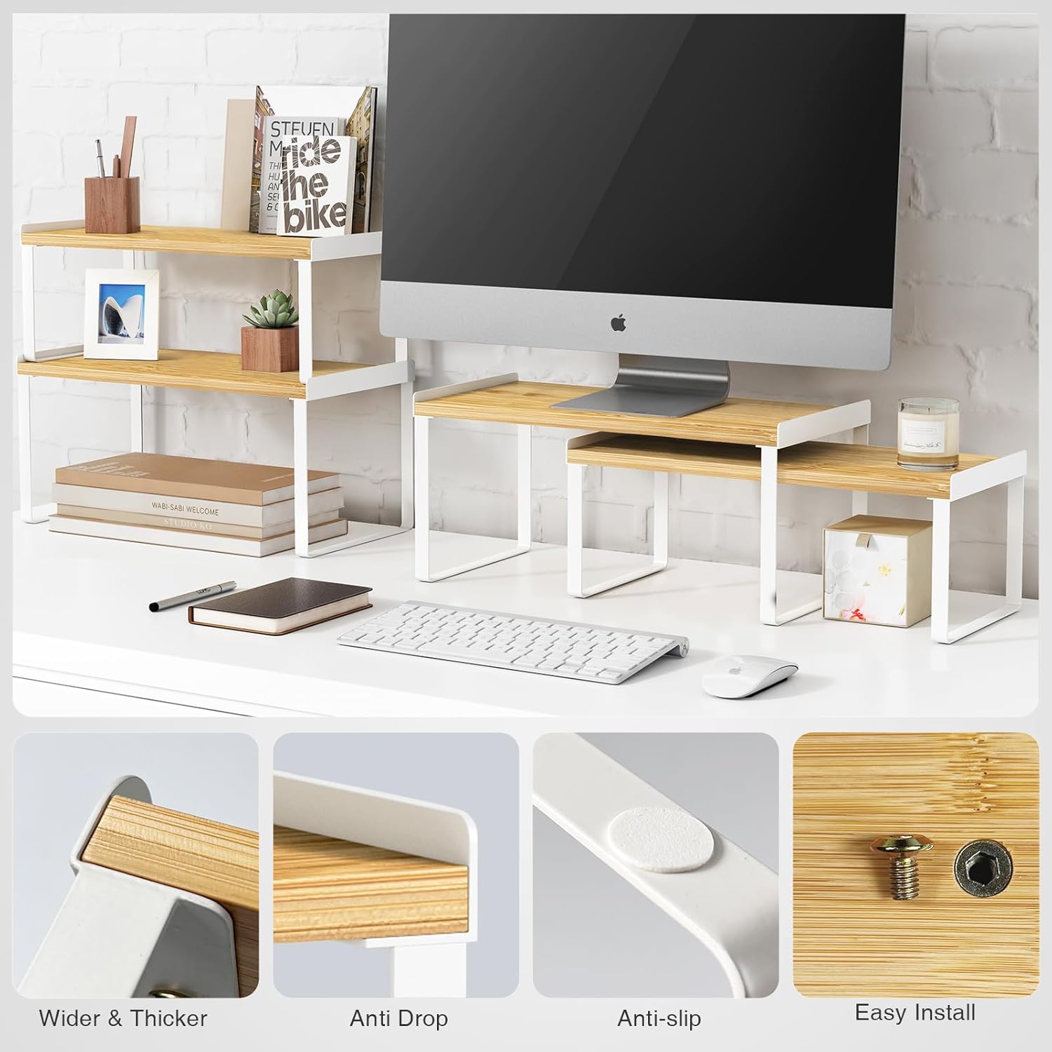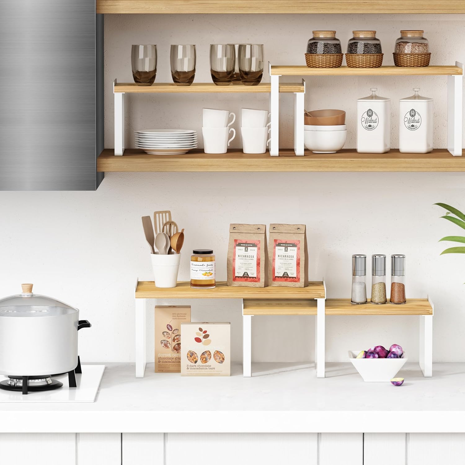 Kitchen Cabinet Organizer Shelf Set of 4, Large Stackable Pantry Cupboard Countertop Storage and Organizer, Desk Shelf Riser, Spice Plate Cup Expandable Storage Rack (Bamboo White)
