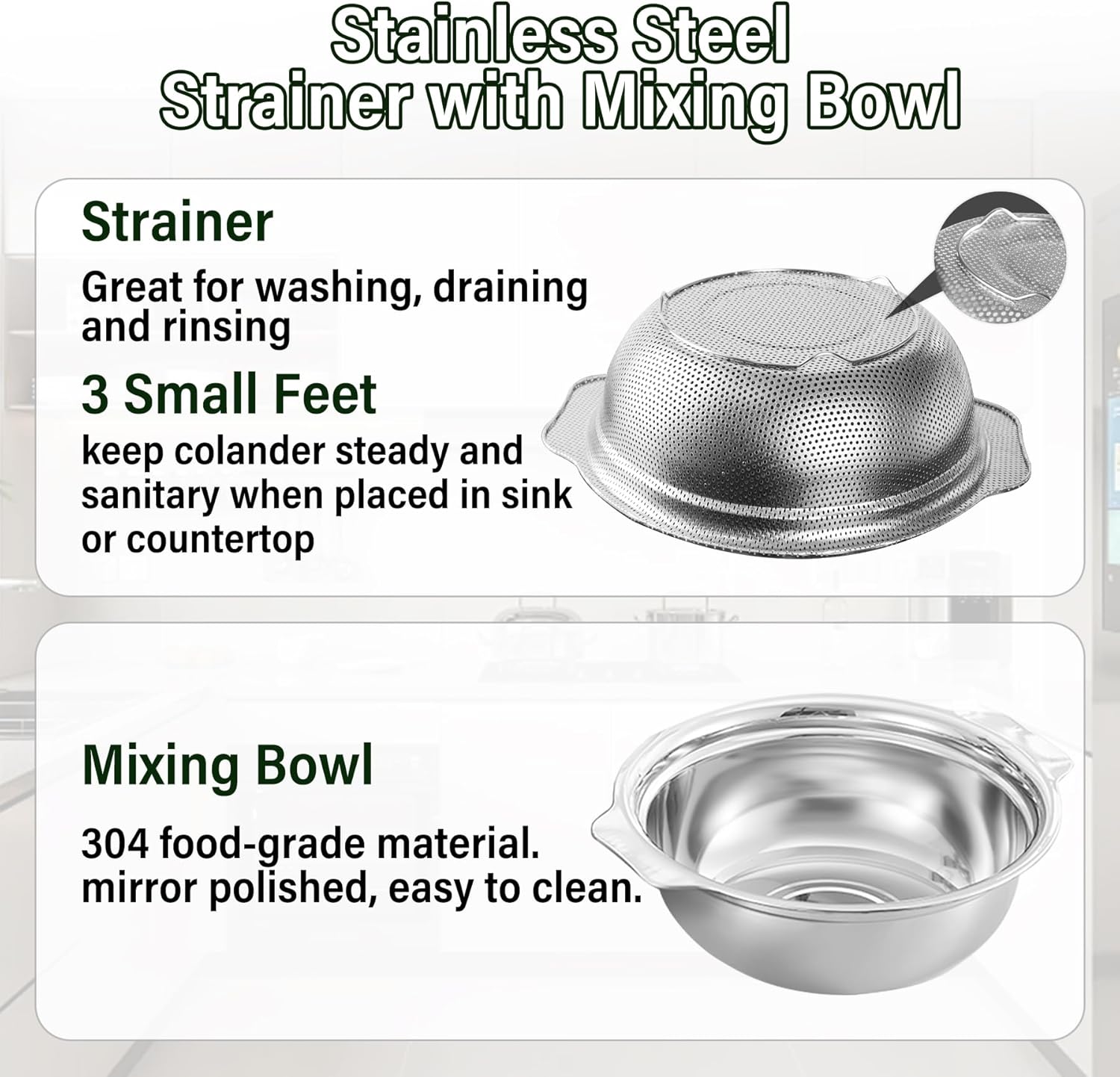 - Stainless Steel Colander: Colander bowl set is made of safe, healthy and durable material, the holes of the strainer are dense and uniform, which can drain quickly. they are an indispensable tool in the kitchen for easy cleaning and food preparation.