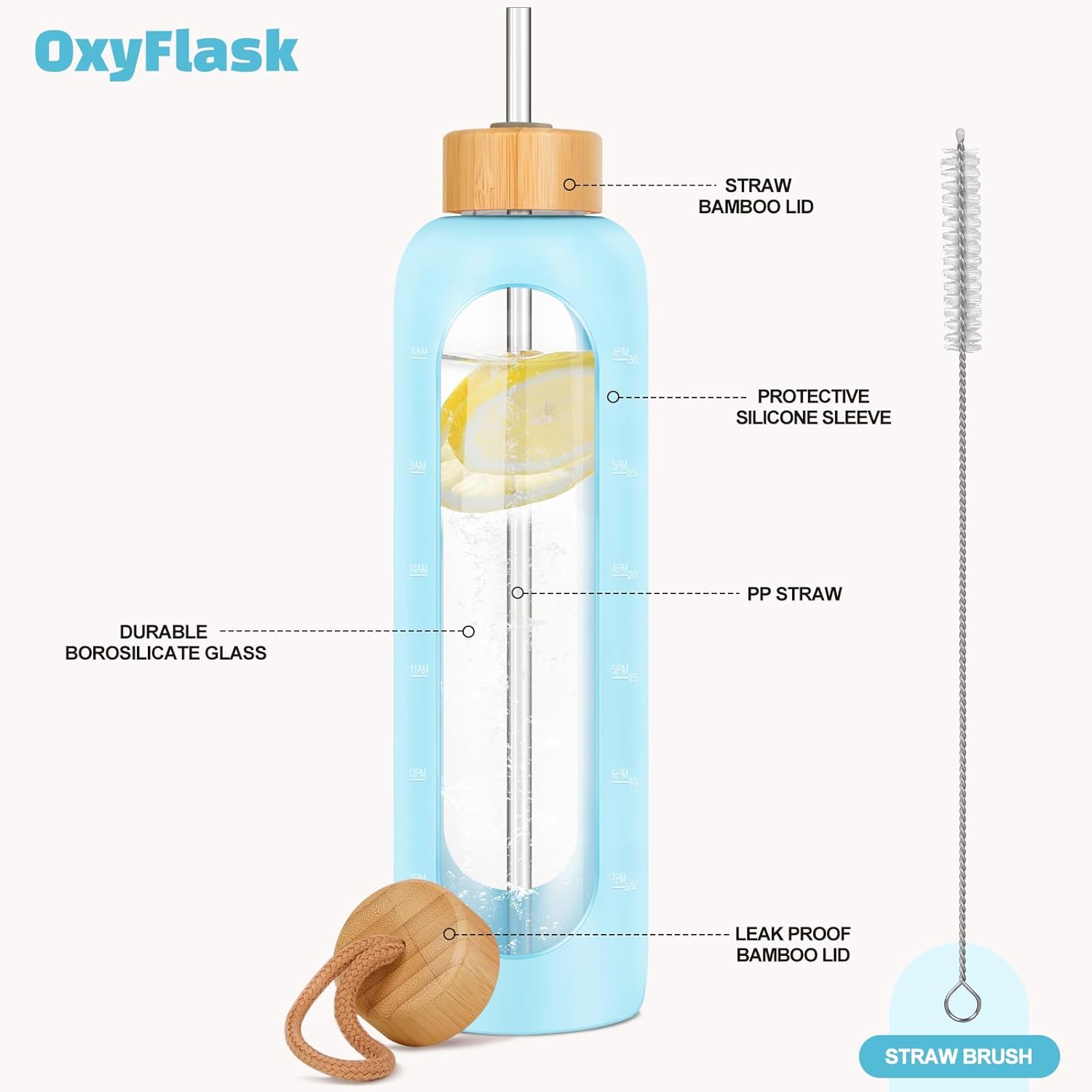 Glass Water Bottles 32 oz - Motivational Drinking Glass Water Bottle with Silicone Sleeve, Straw & 2 Bamboo Lids - 1 Liter Clear Borosilicate Daily Intake Tumbler with Time Marker - Glow in Dark