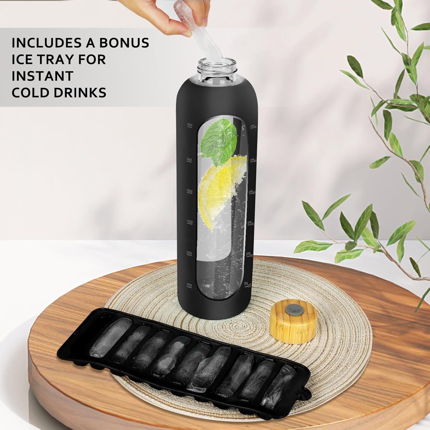 Glass Water Bottles 32 oz - Motivational Drinking Glass Water Bottle with Silicone Sleeve, Straw & 2 Bamboo Lids - 1 Liter Clear Borosilicate Daily Intake Tumbler with Time Marker - Jet Black