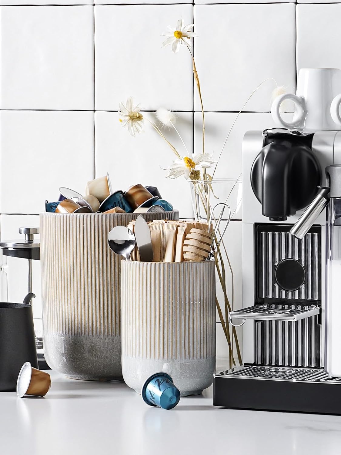 - Multi-Functional Utensil Holder: These kitchen utensil holders do more than just store cooking utensils; They also double as elegant vases, offering a stylish home for hair tools like combs, and can seamlessly house coffee pods and stirrers on your bar countertop; Their versatility knows no bounds