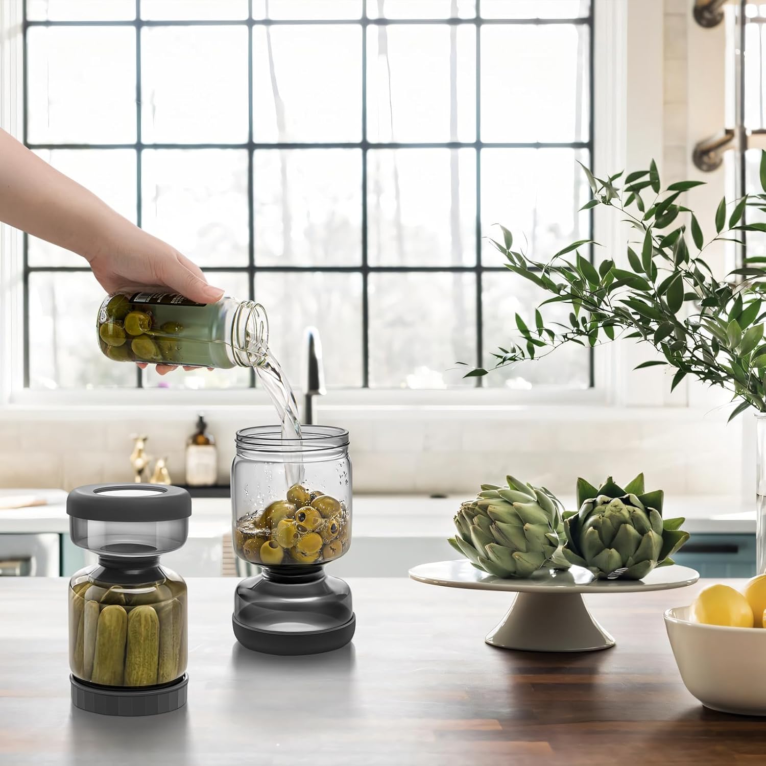 - 【A Must for Pickle Lovers-Hourglass Flip Design】Pickle Juice Separator Jar is designed with 2 compartments to separate liquids from food.Just flip it to say goodbye to the pickle and liquid struggle.No more wet hands or duty pickle juice!then flip back the jar and let the pickles soak in brine again to pickle.Pefect for Olives,Gherkins,Sliced Pickles.Ideal to hold fruit such as maraschino cherries,pineapple tidbits,apples. vegetables such as onions,gerkins,garlic,beets,okra,banana,mushrooms.