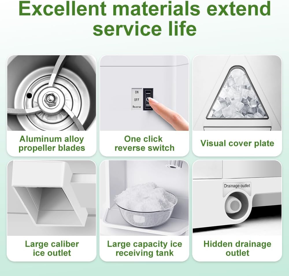 - 【More Efficient】Equipped with 300W, high-speed efficient motor and a large ice drawer, Vtsmax ice crusher will shave over 881lbs of ice per hour. Provids a large amount of ice and greatly improves work efficiency for domestic and commercial use, saving you valuable time and effort. At the same time, we also provide ice 1 x shovel and water outlet 1 x pipe for your convenience.