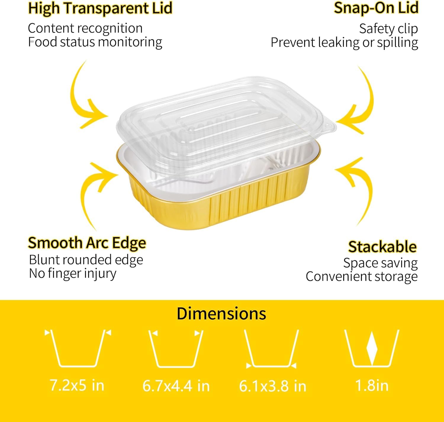 - 【40 Pack Foil Pans with Lids】You will get 40pcs aluminum foil pans and 40pcs PP lids (Size: 7.2"×5"×1.8"). The 1lbs deep portable container is perfect for your lunch. These aluminum foil baking pans with lids are great for baking and making bread. These takeout tin pans have smooth edges so no need to worry about stabbing your hands, and the PP lids seal tightly to prevent leaks and spills from the sides.