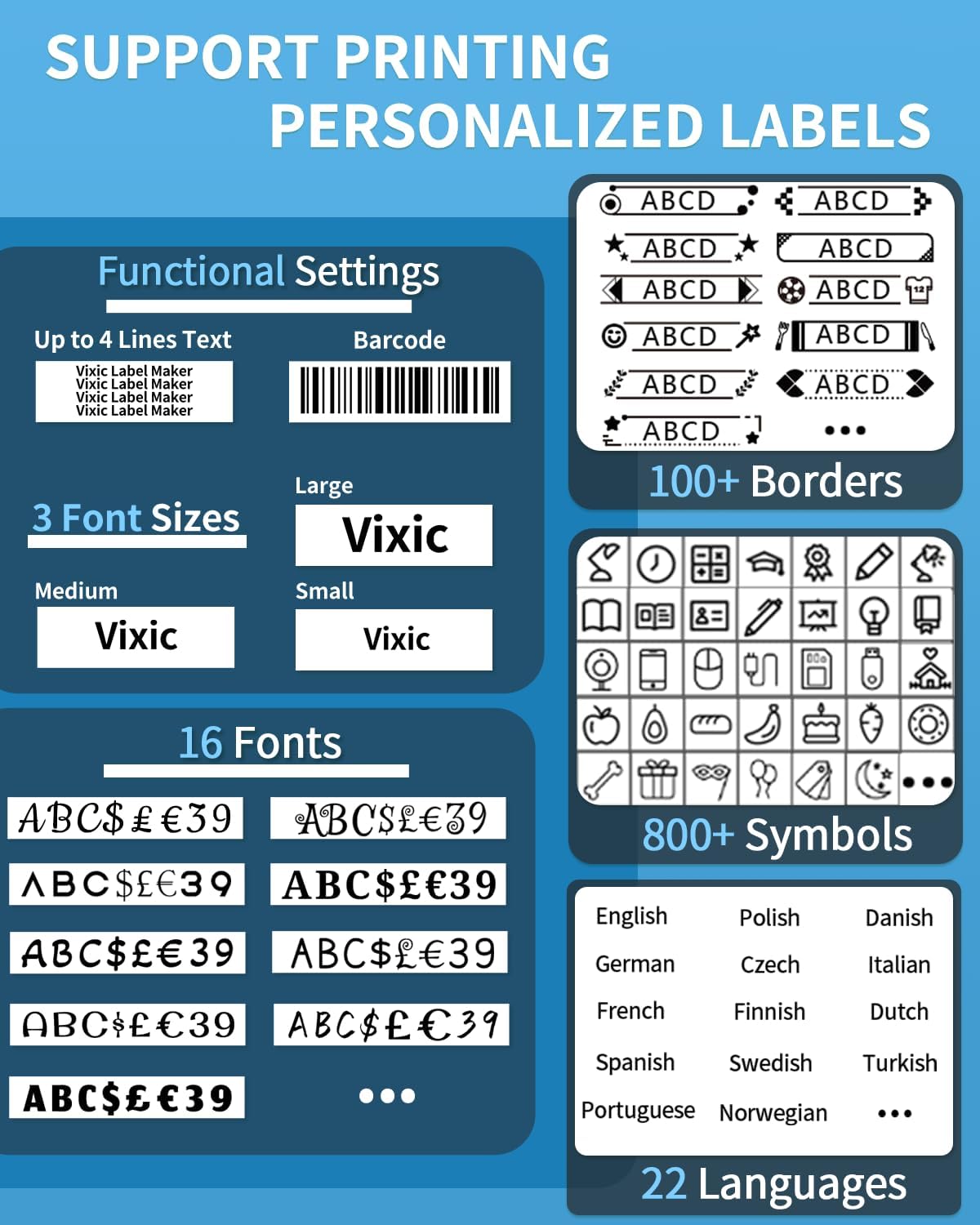 - Personalize Your Labels with the Vixic H1100 Lable Maker's Creative Functions: Choose from 16 unique fonts, 100+ frames, 800+ symbols, 6 patterns, and barcode printing capability. Print up to 4 lines on labels up to 12mm wide. Cable mode supports wrap and flag options. Easily resize letters to small, medium, or large sizes