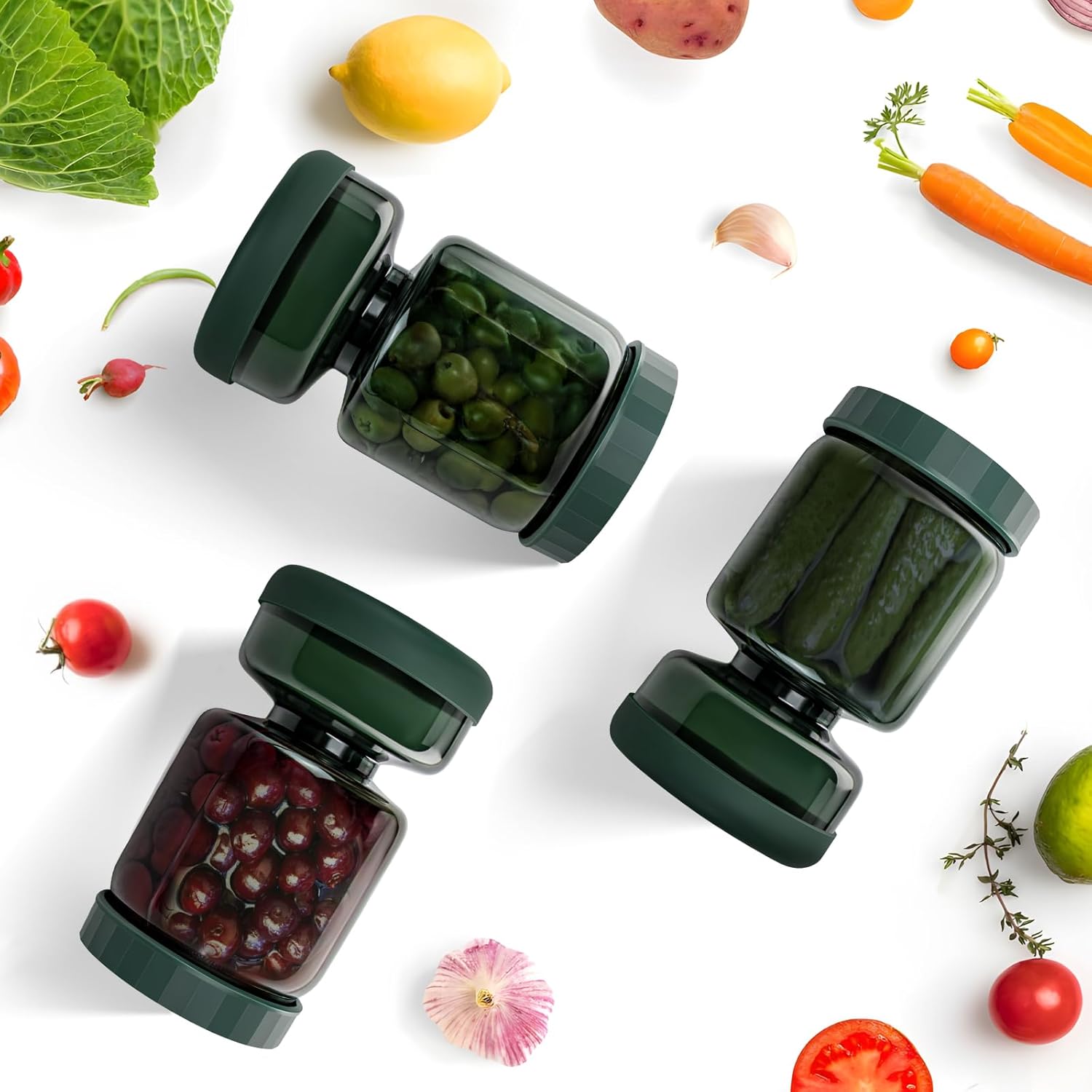 - 【UPGRADE DOUBLE LEAK-PROOF】 The pickle jar with strainer flip takes a double leak-proof design. The threaded design on the inside of the lid with a silicone sealing ring ensures an airtight seal, keeping the olives tasty and fresher in the juice for longer. Making sure the lid is aligned and tightly seated before flipping means no leaks. The pickle container with strainer's bottom with a non-slip silicone case anti-drop and anti-skid can be used with confidence in your refridge or cupboard